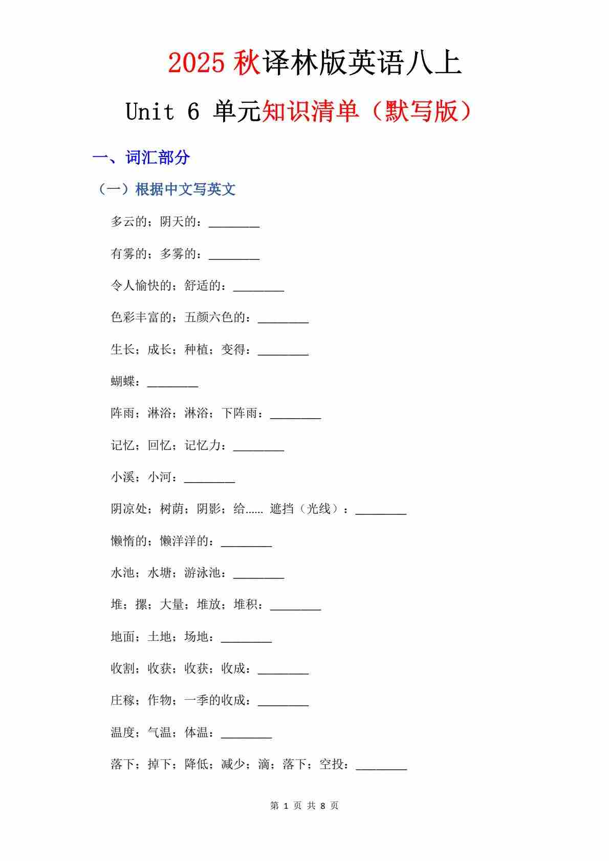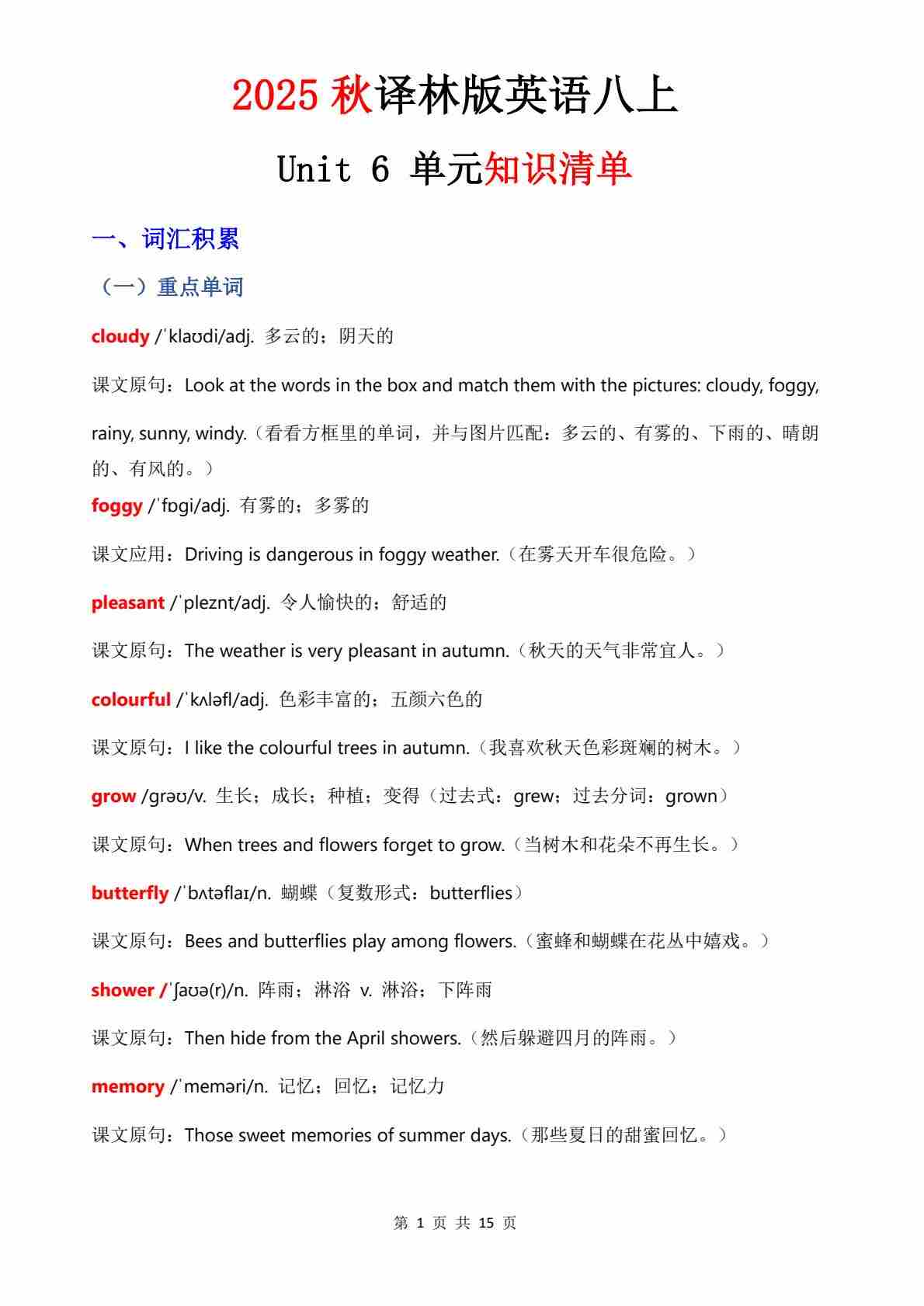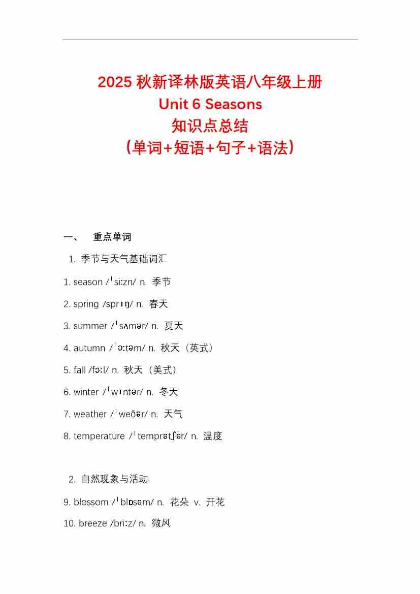 Unit 6 Seasons 知识点总结(单词 短语 句子 语法)2025秋新译林版英语八年级上册