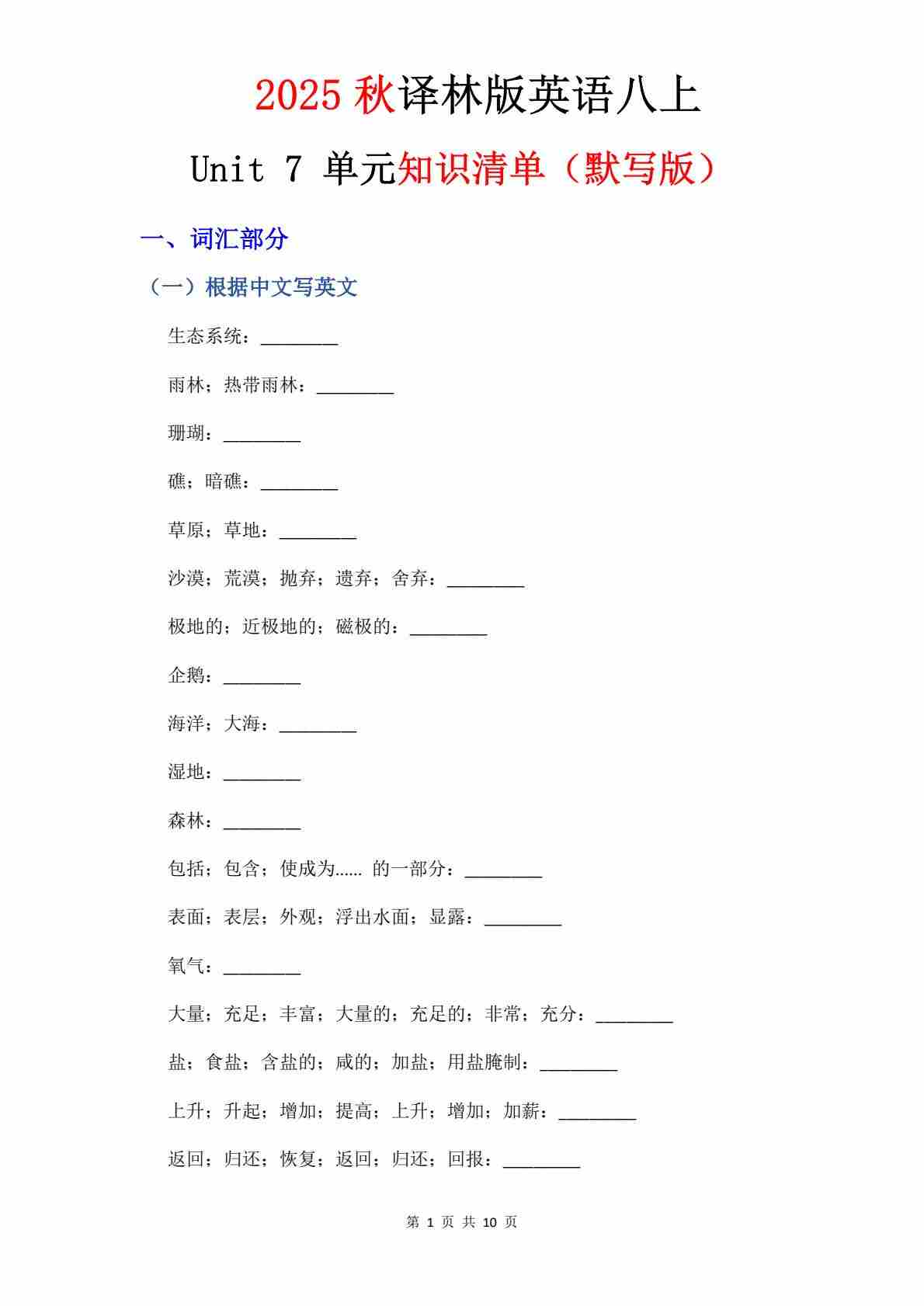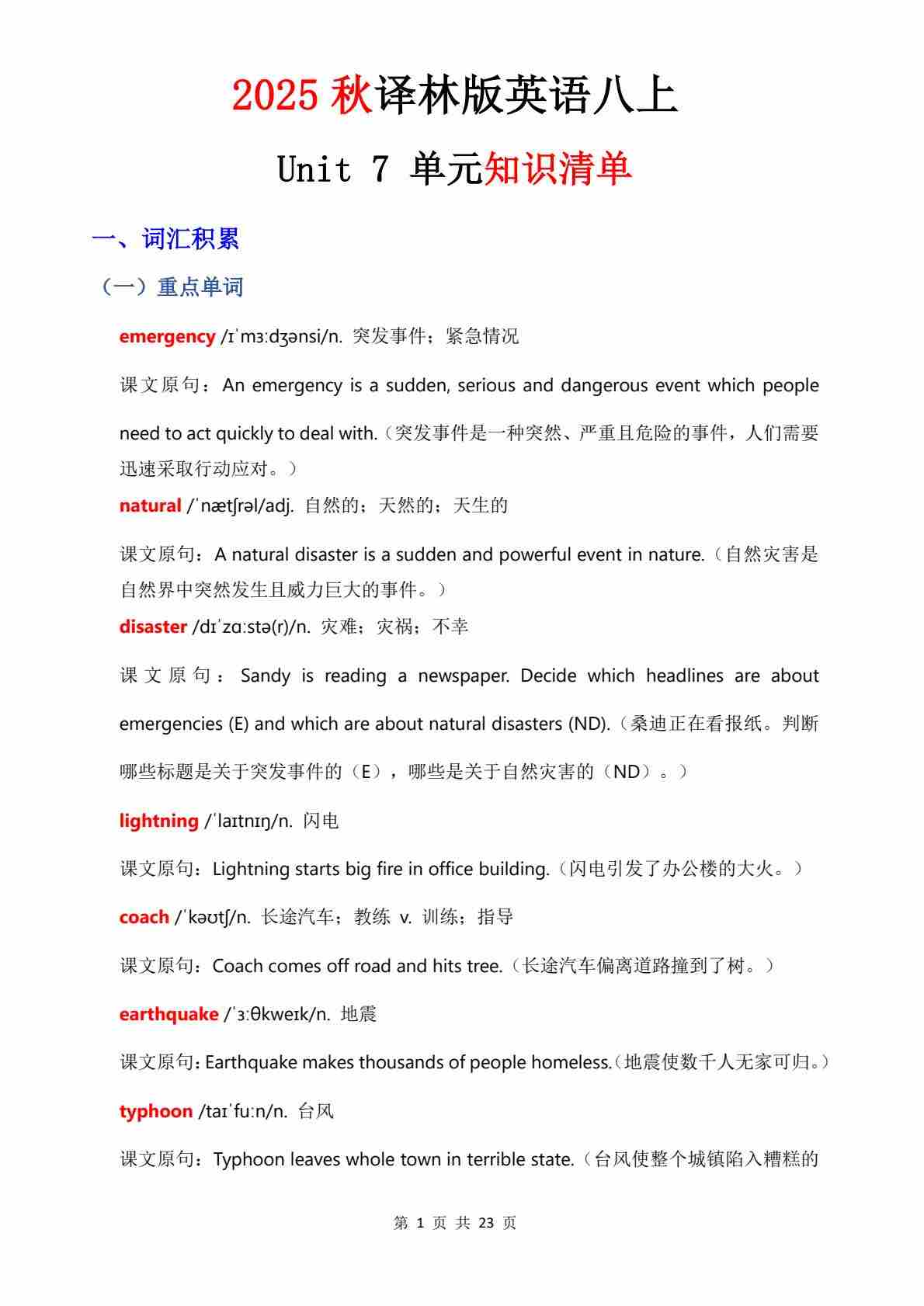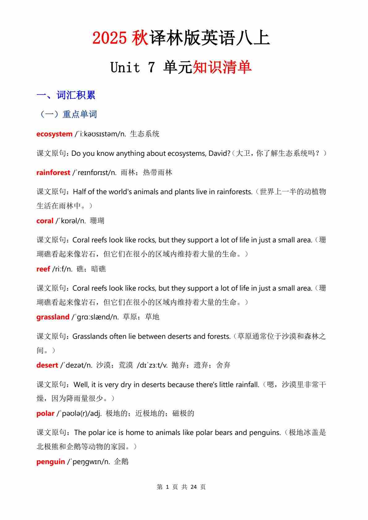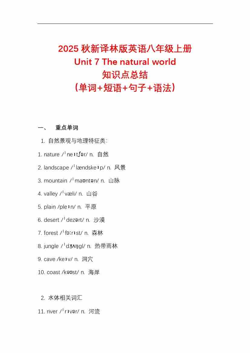 Unit 7 The natural world 知识点总结(单词 短语 句子 语法)2025秋新译林版英语八年级上册