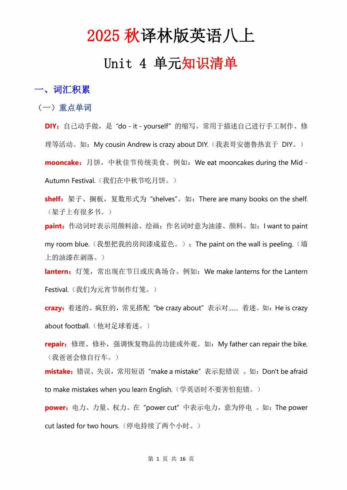 Unit 4 Hands-on fun 知识点总结(单词 短语 句子 语法)—2025秋新译林版英语八年级上册