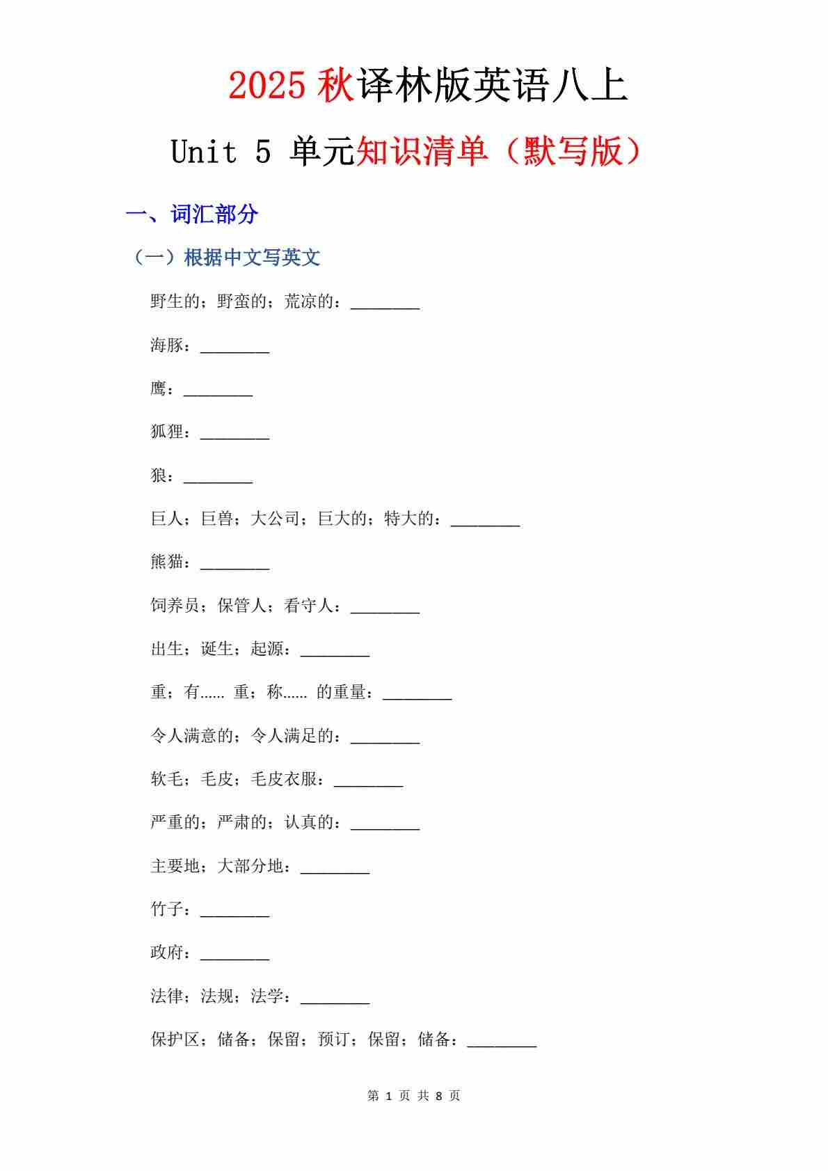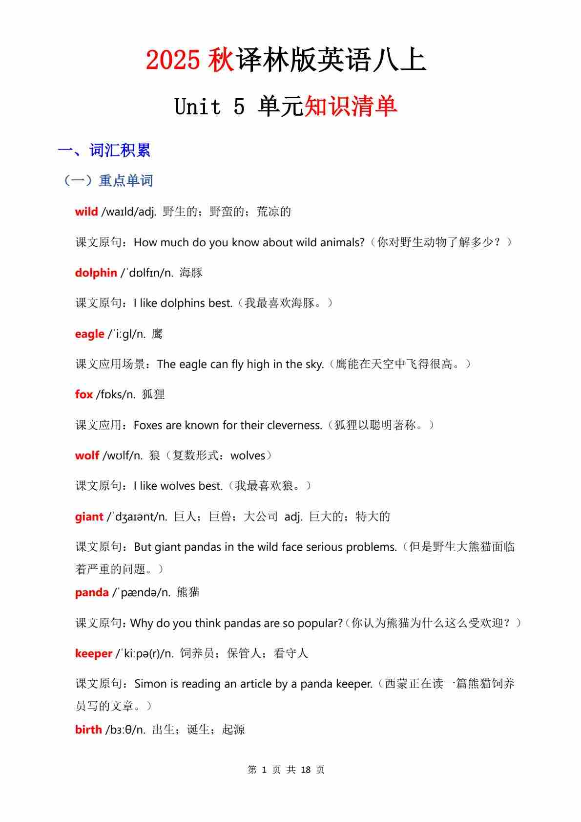 Unit 5 Wild animals 知识点总结(单词 短语 句子 语法)—2025秋新译林版英语八年级上册