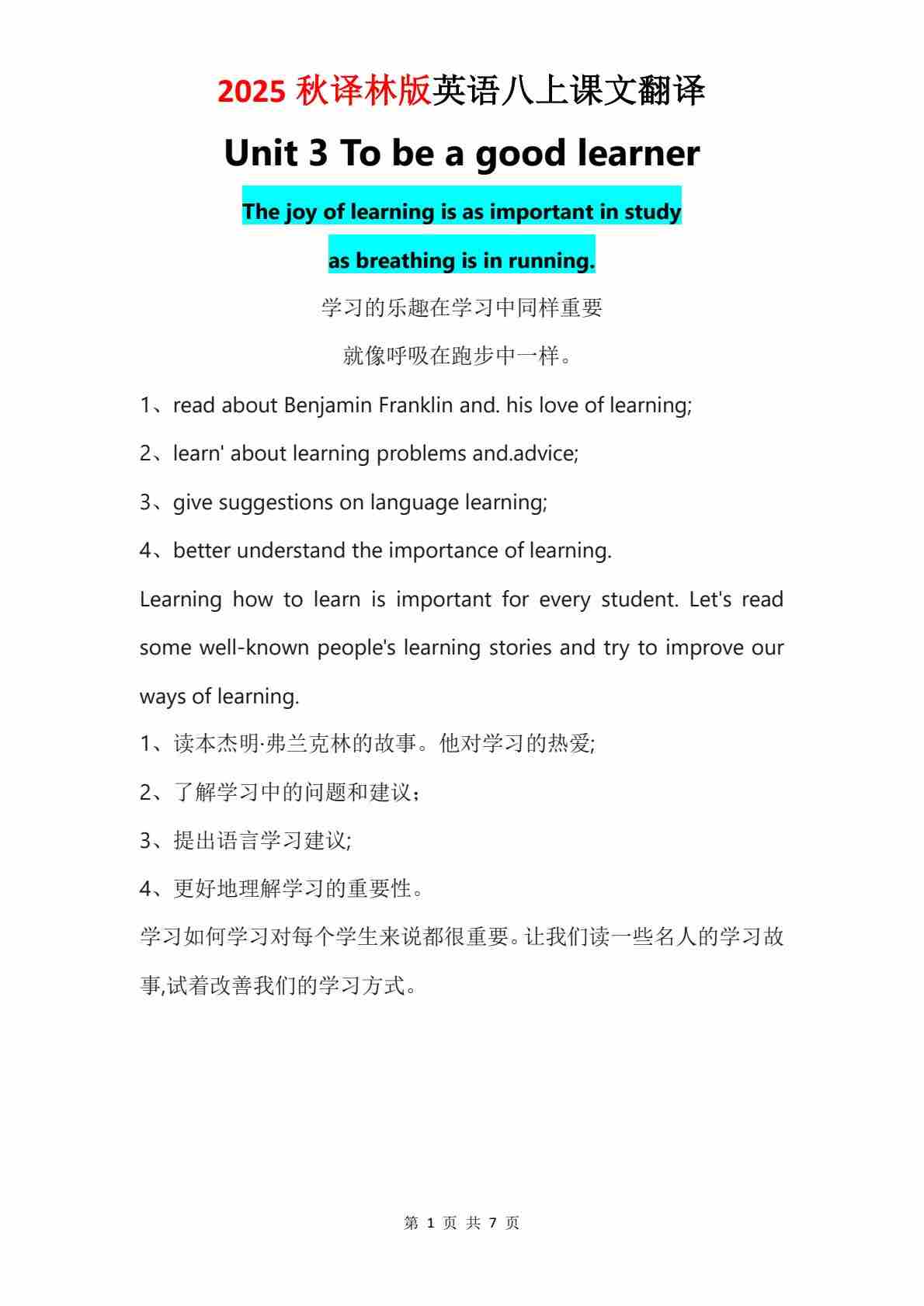 Unit 3 To be a good learner八上英语--译林版--课堂笔记