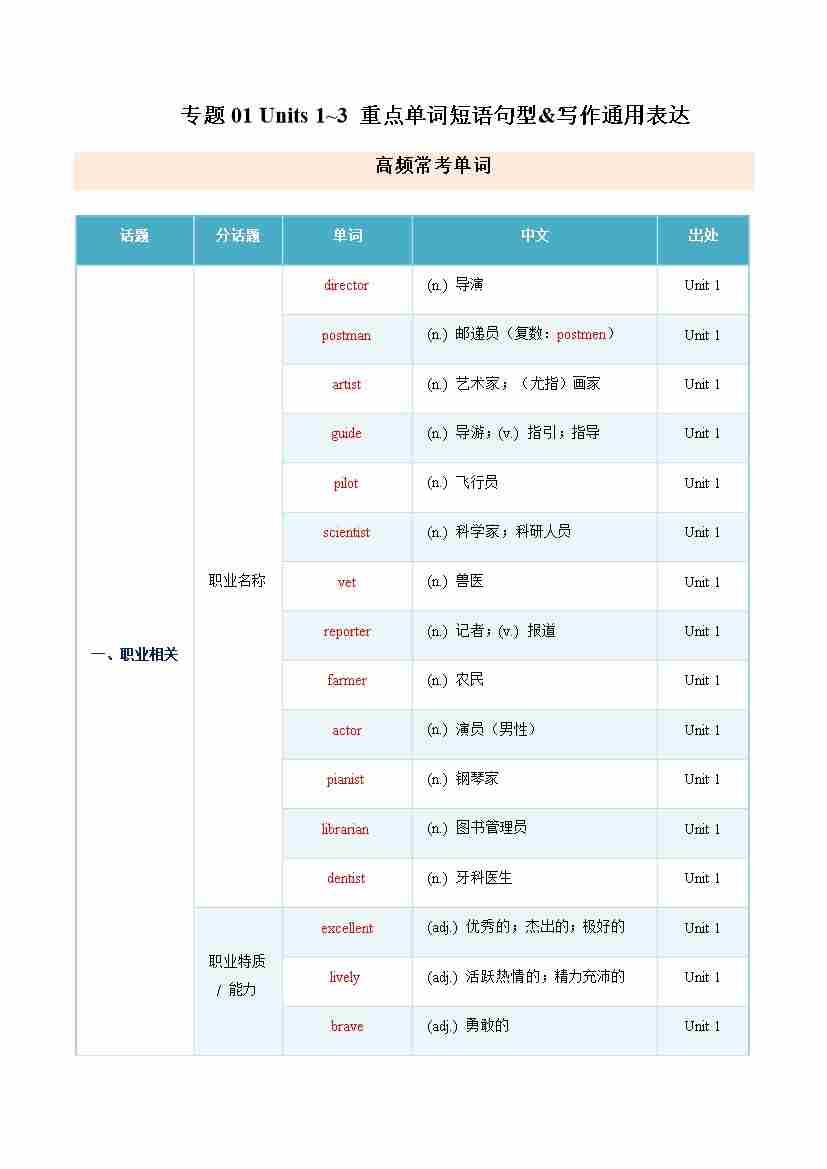 Units 1~3 重点单词短语句型&写作通用表达(期中知识清单)(背诵版)
