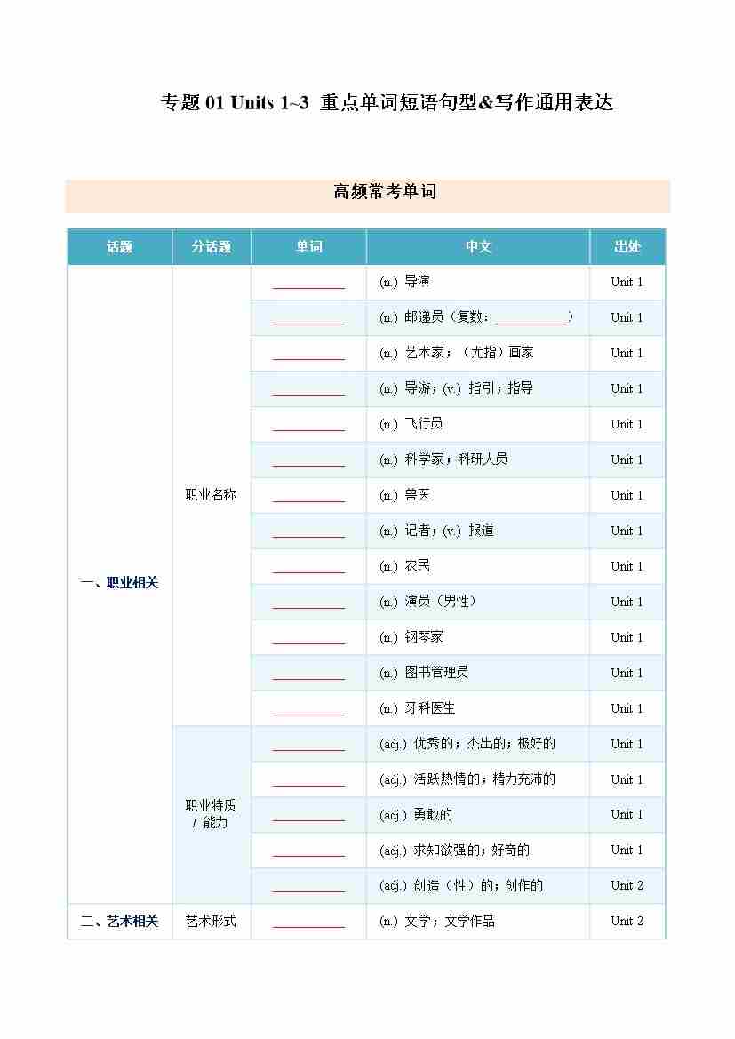 Units 1~3 重点单词短语句型---写作通用表达(期中知识清单)(挖空版)