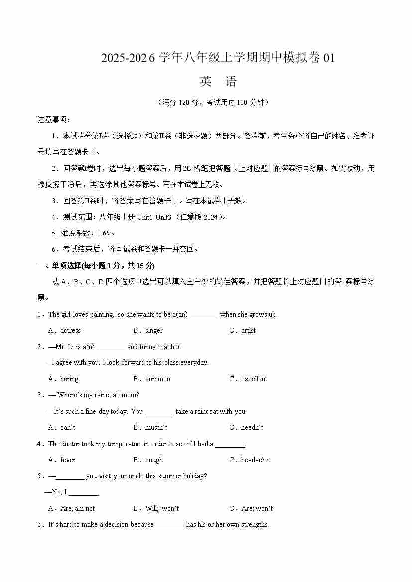 八年级英语上学期期中模拟卷01(考试版A4)
