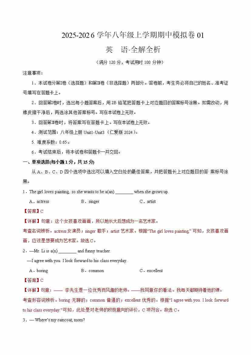 八年级英语上学期期中模拟卷01(解析版)