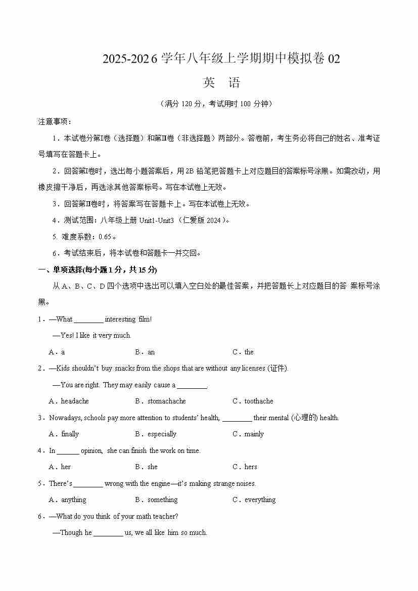 八年级英语上学期期中模拟卷02(考试版A4)