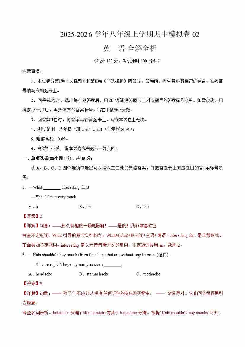 八年级英语上学期期中模拟卷02(解析版)