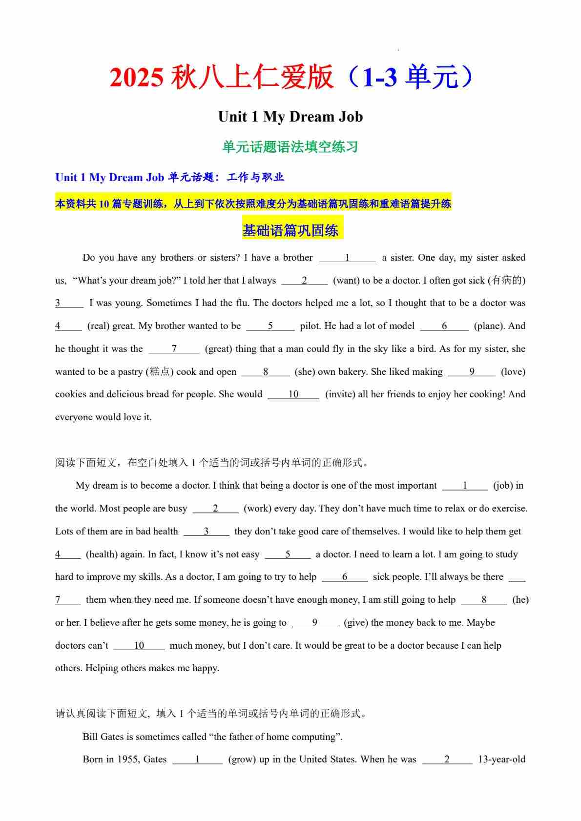 八上英语仁爱Unit1-Unit3单元话题语法填空练习(合并版)PDF