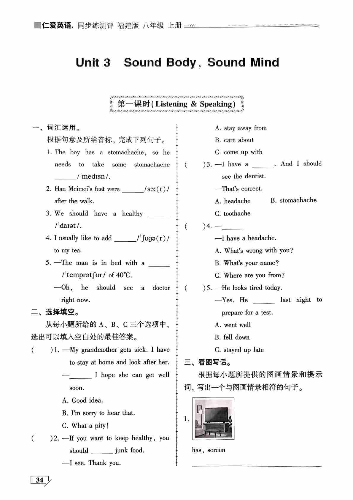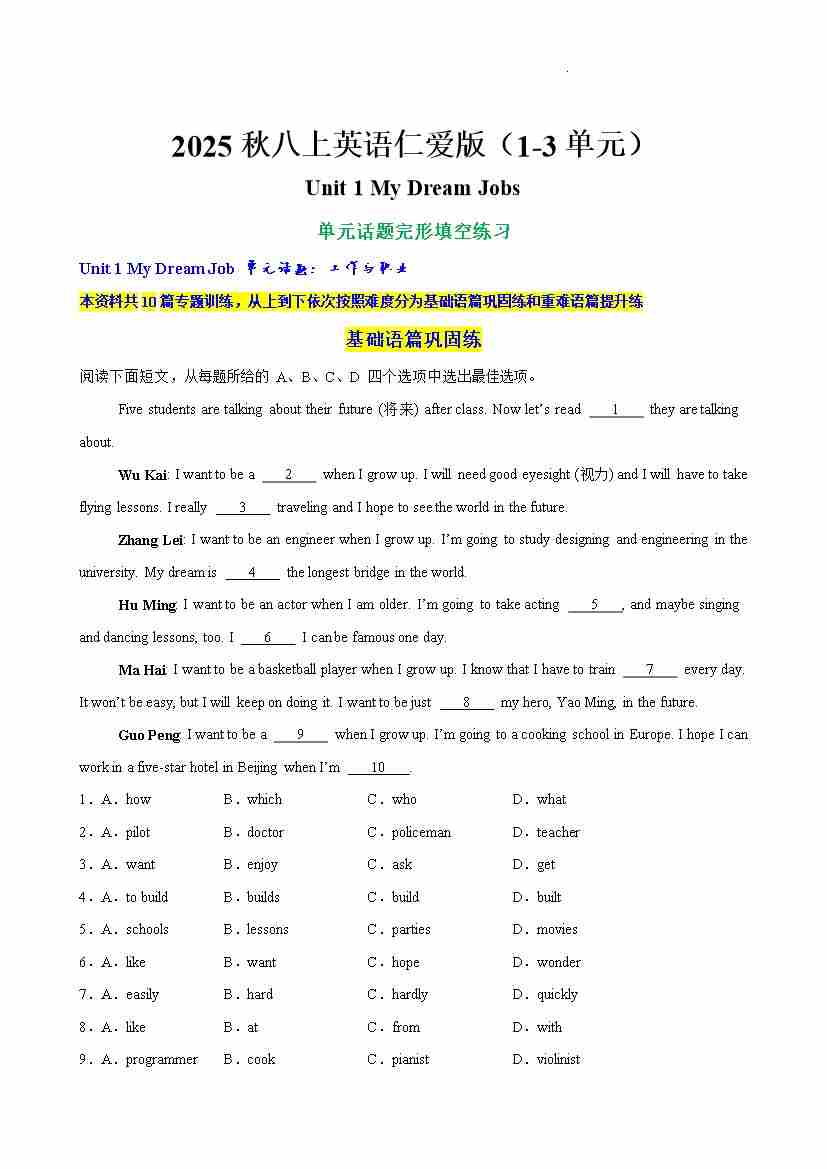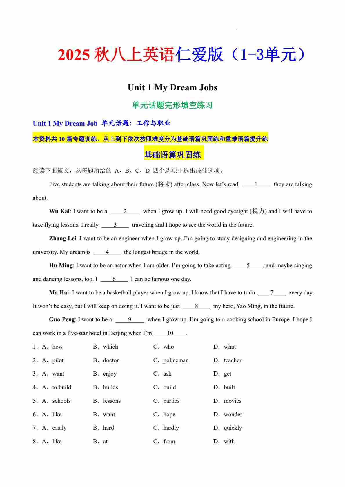 八上英语仁爱Unit1-Unit3单元话题完形填空练习----(合并版)