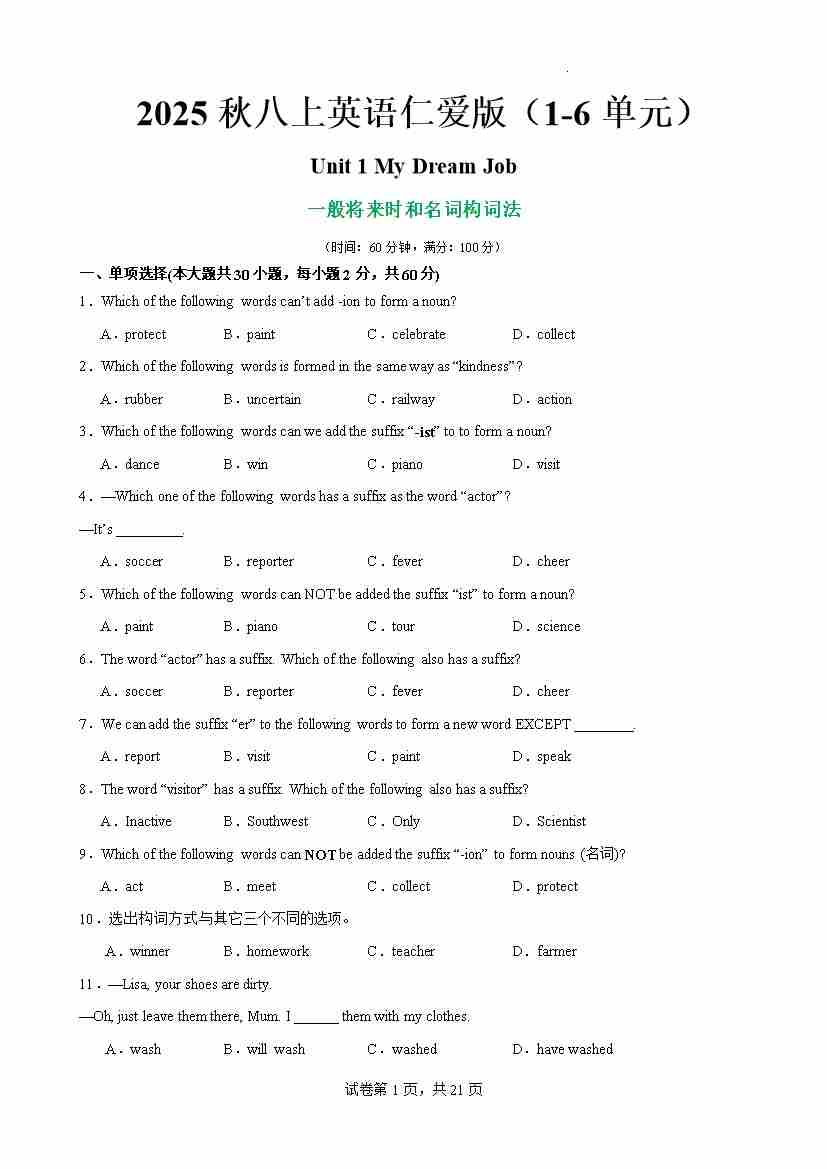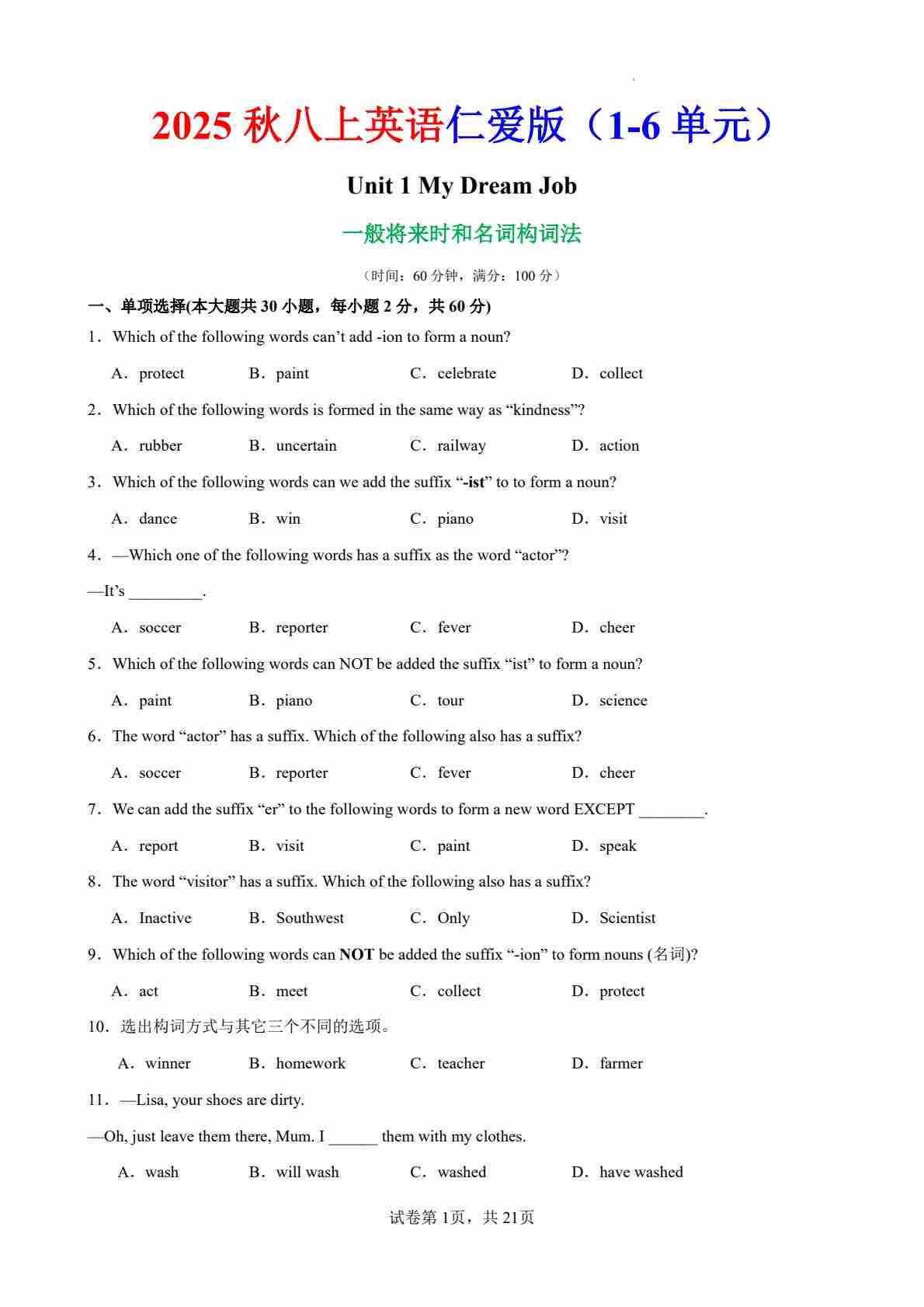 八上英语仁爱Unit 1 -Unit6 语法Grammar (合并版)PDF
