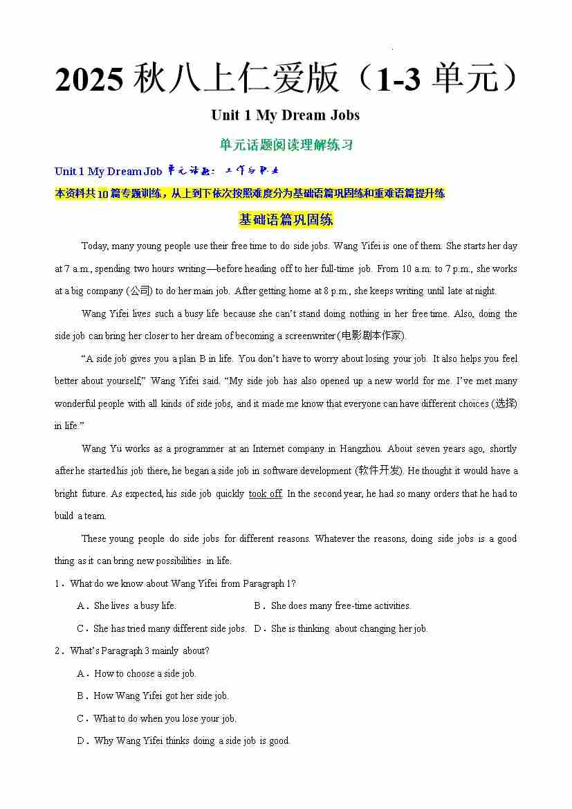 八上英语仁爱Unit 1-Unit3单元话题阅读理解练习----(合并版)