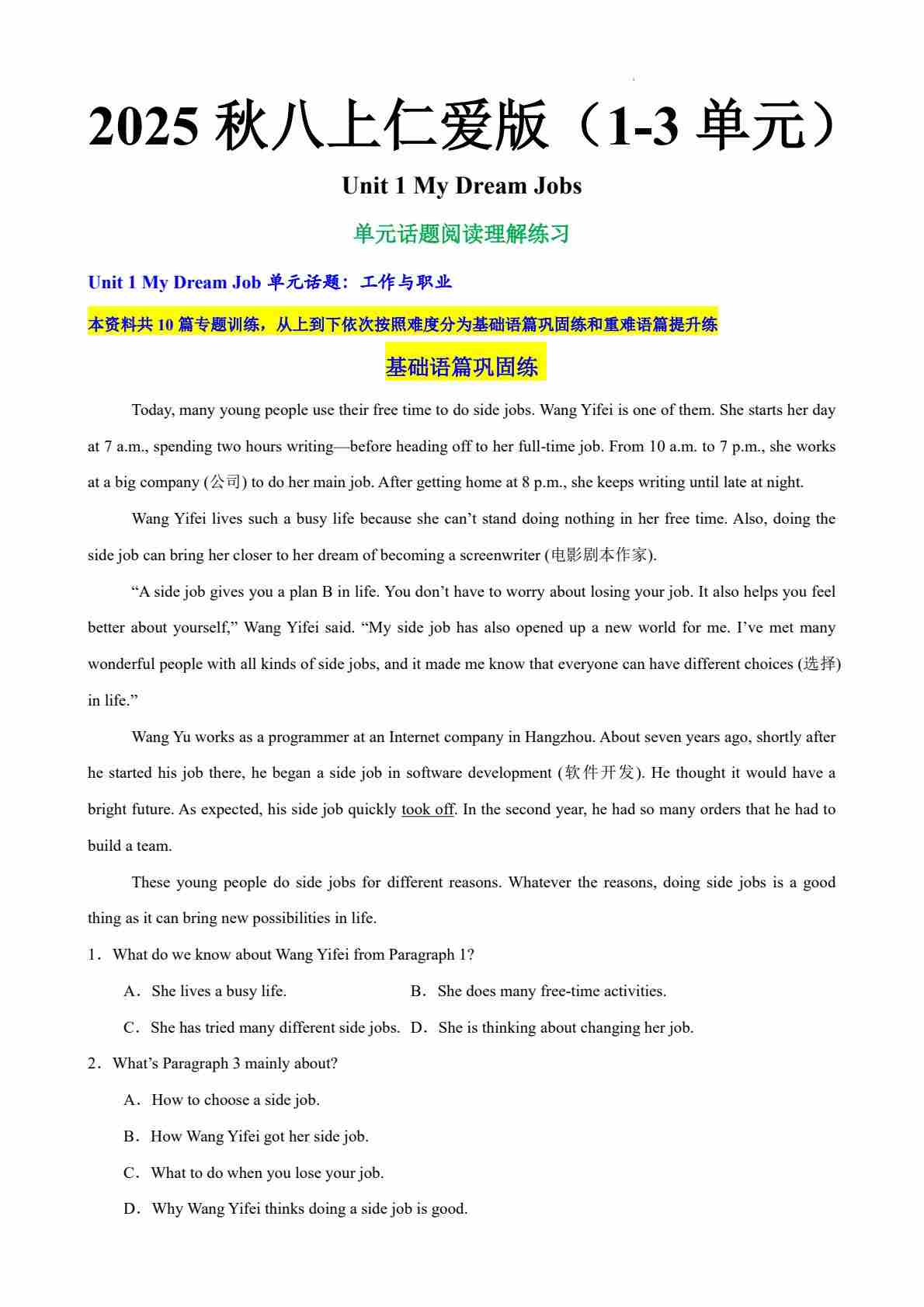 八上英语仁爱Unit 1-Unit3单元话题阅读理解练习(原卷版)PDF