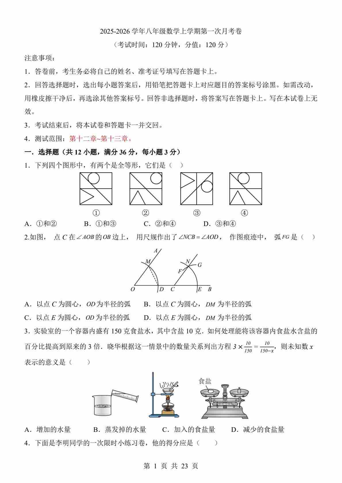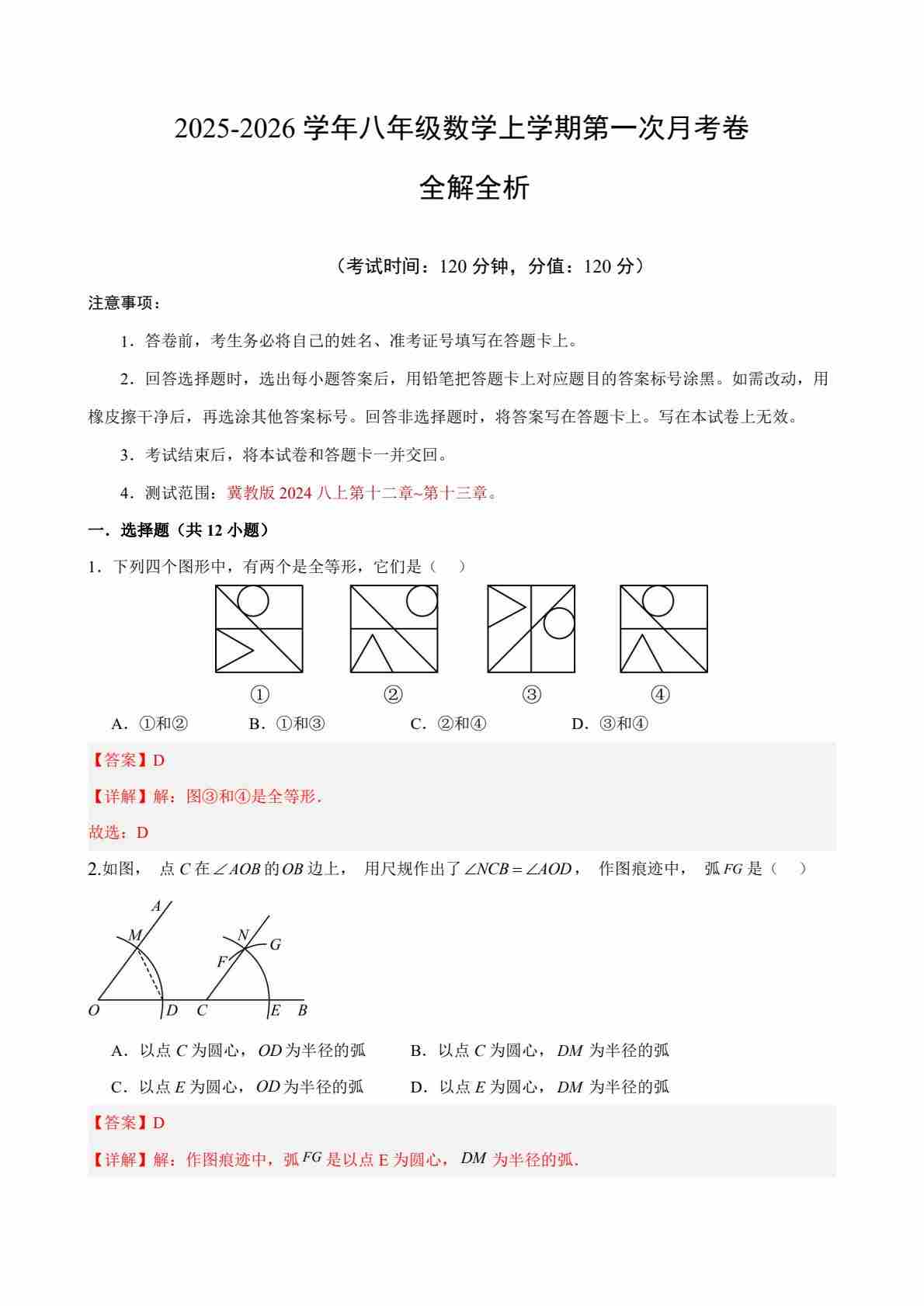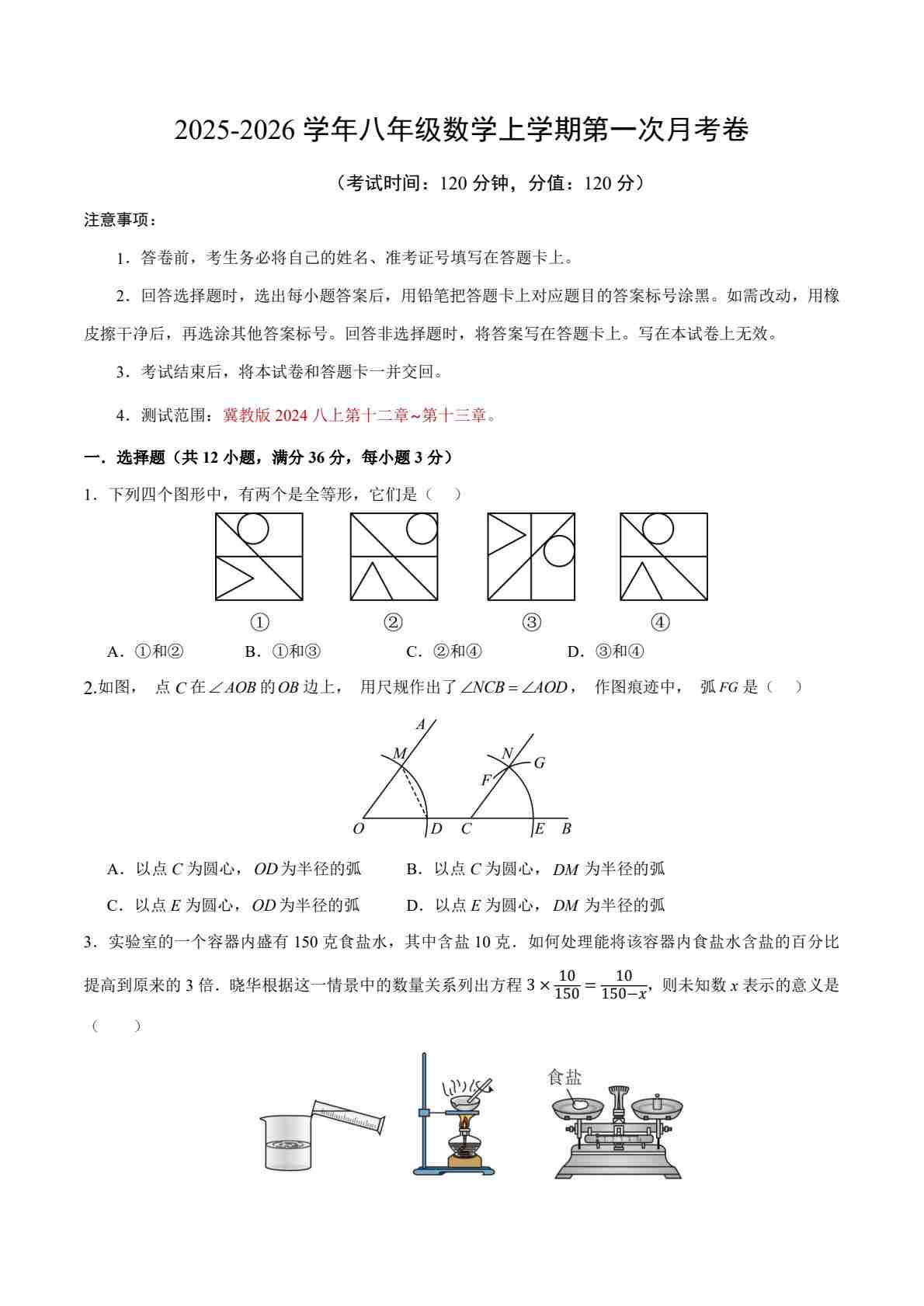 【冀教】8上数学第1次月考【第12~13章】