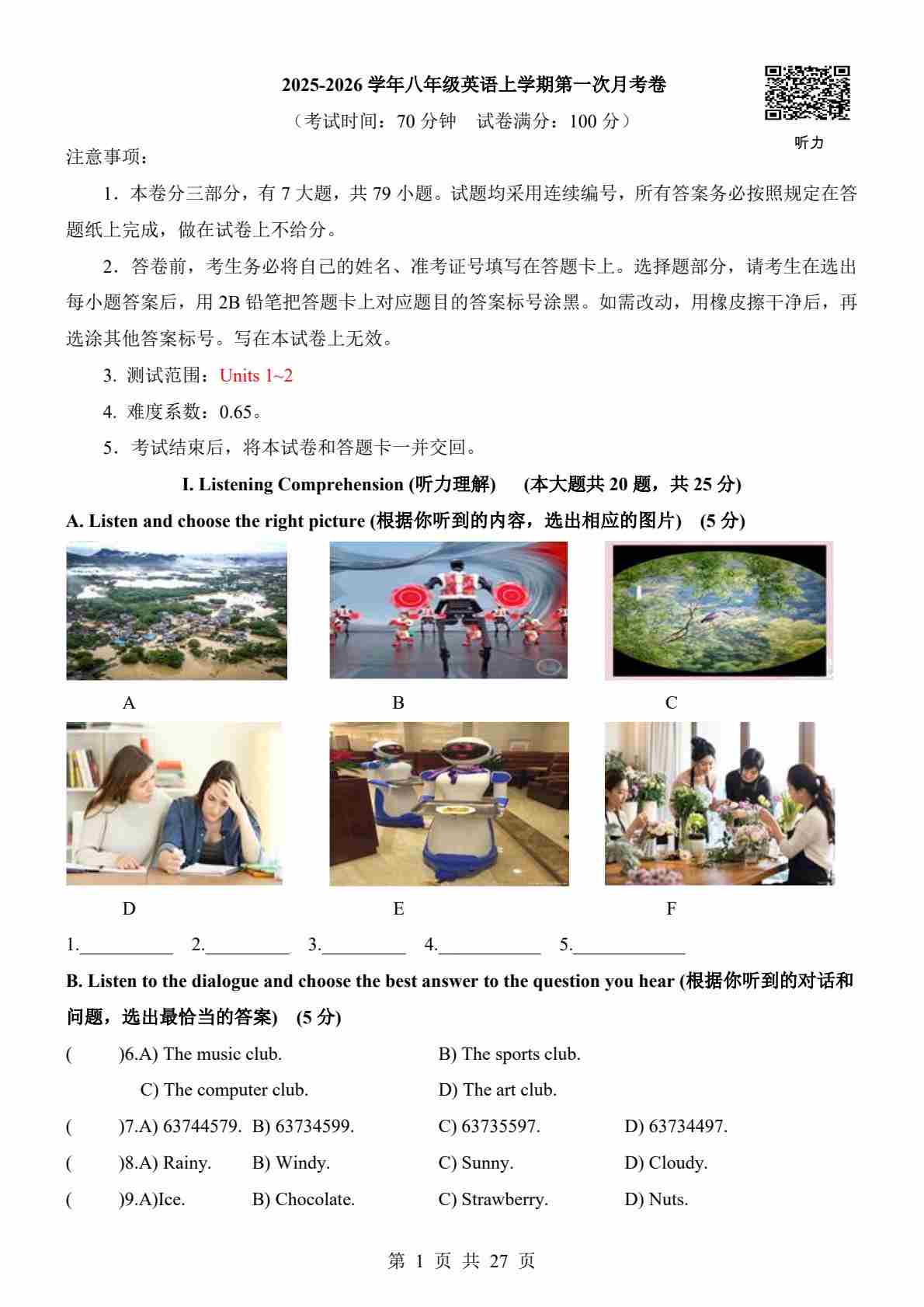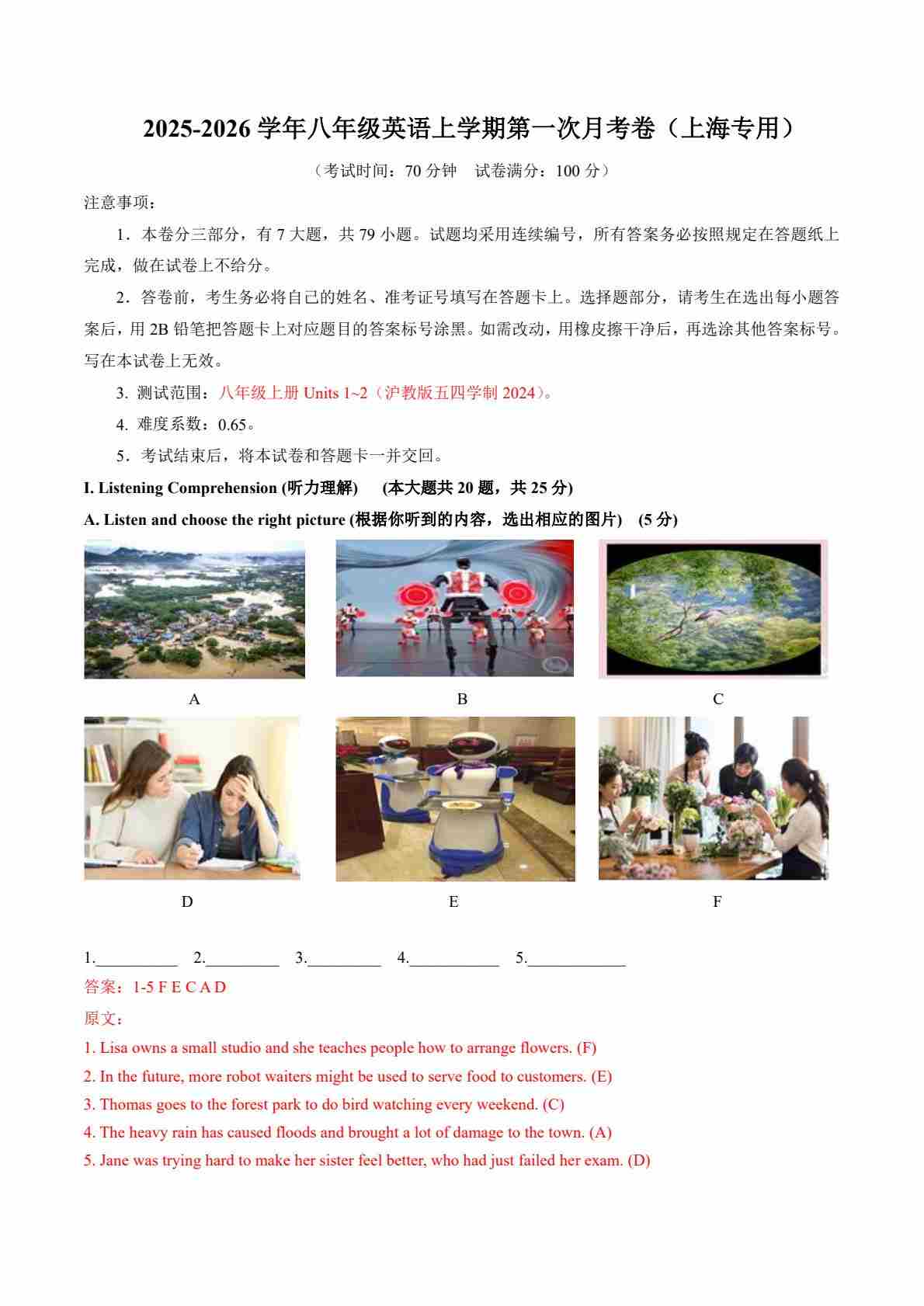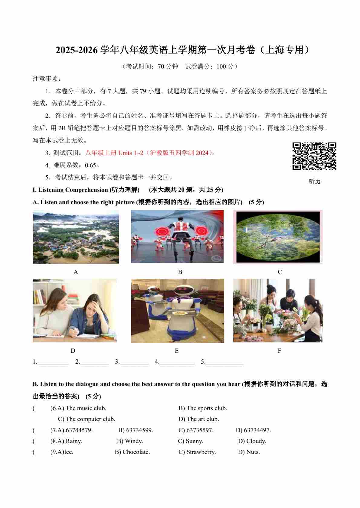【沪教54】8上英语第1次月考【U1-2】