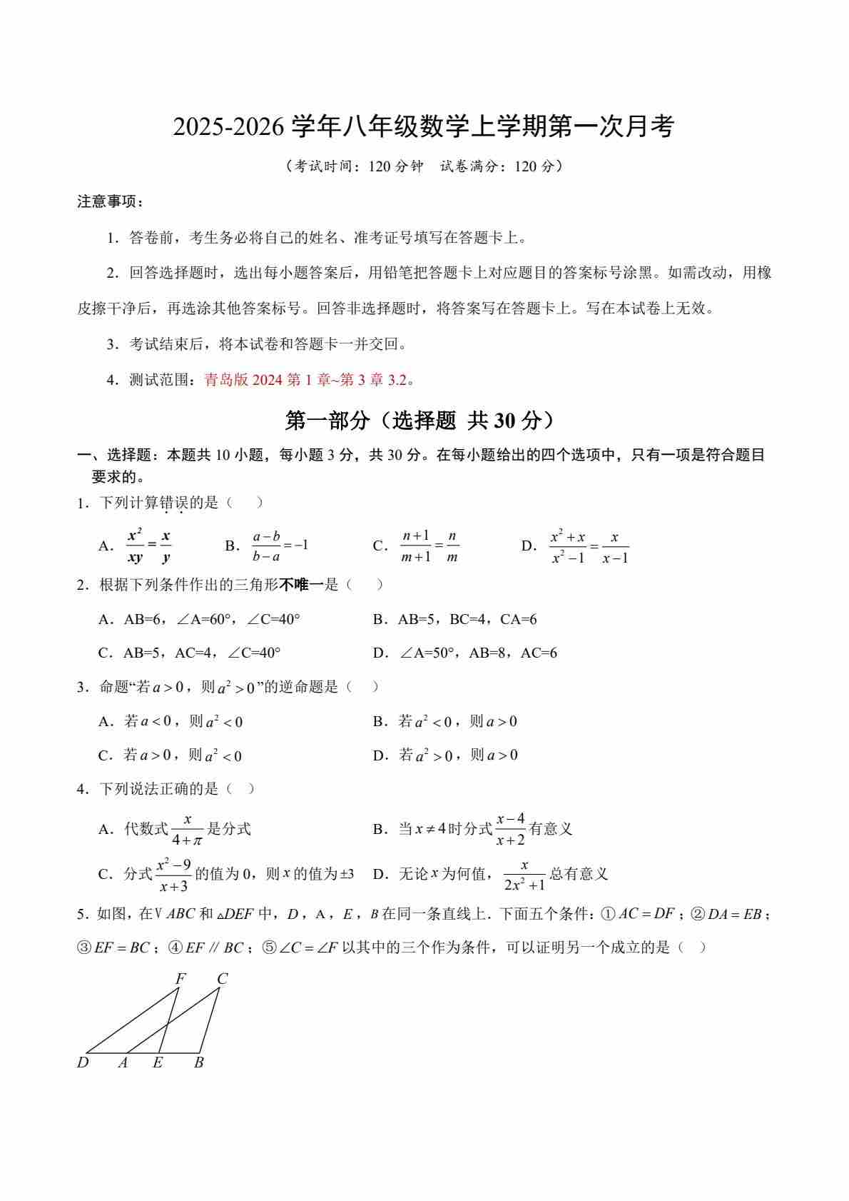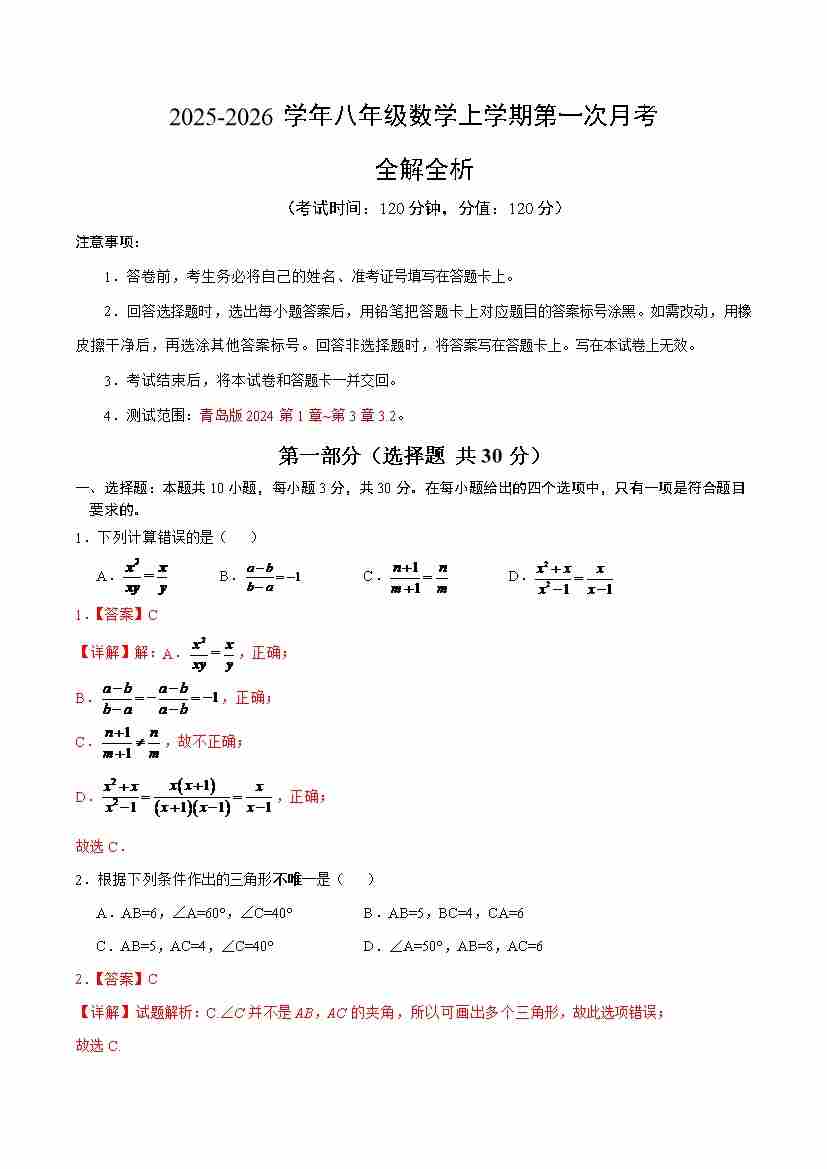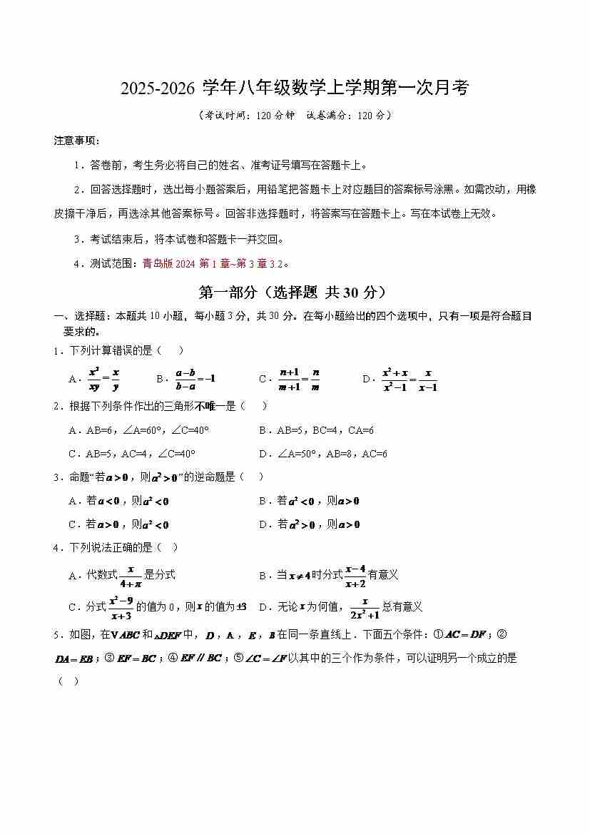 八上数学第一次月考【测试范围:青岛版第1章~第3章3.2】----(考试版)