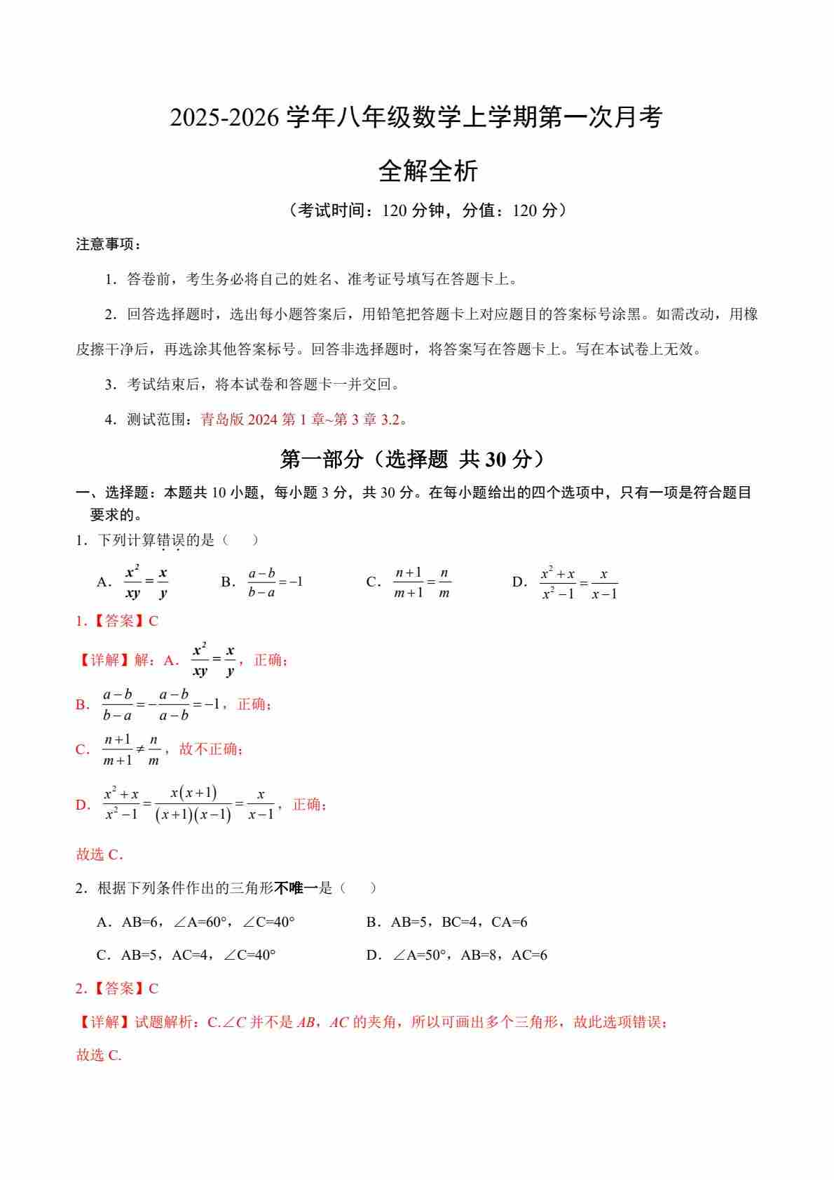 八上数学第一次月考(全解全析)----(青岛版)