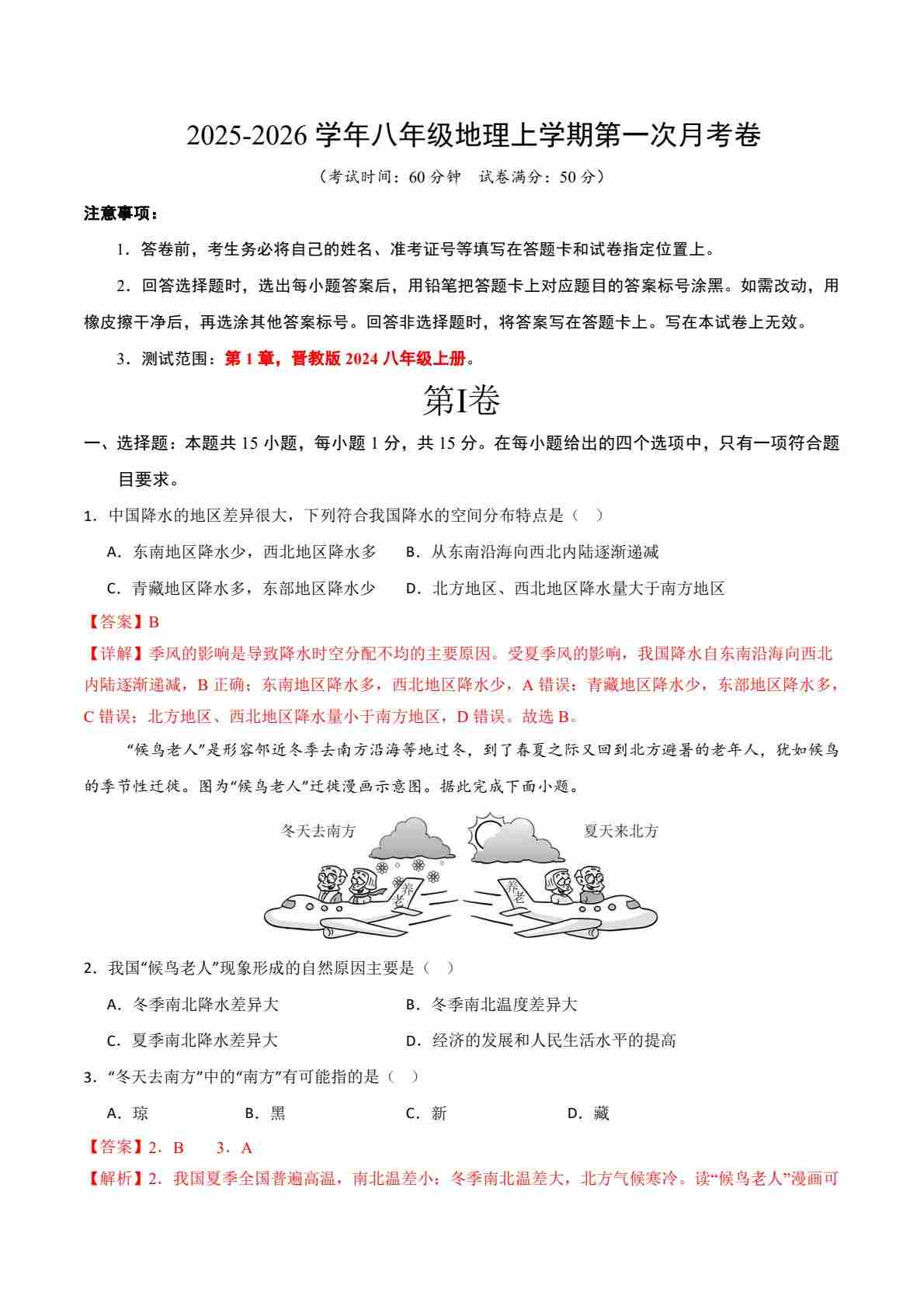 八年级地理第一次月考卷(全解全析)(晋教版2024)