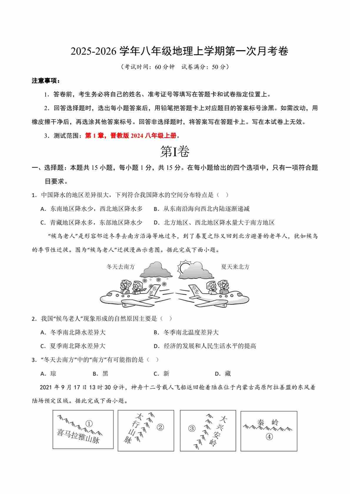 八年级地理第一次月考卷(考试版)(晋教版2024)