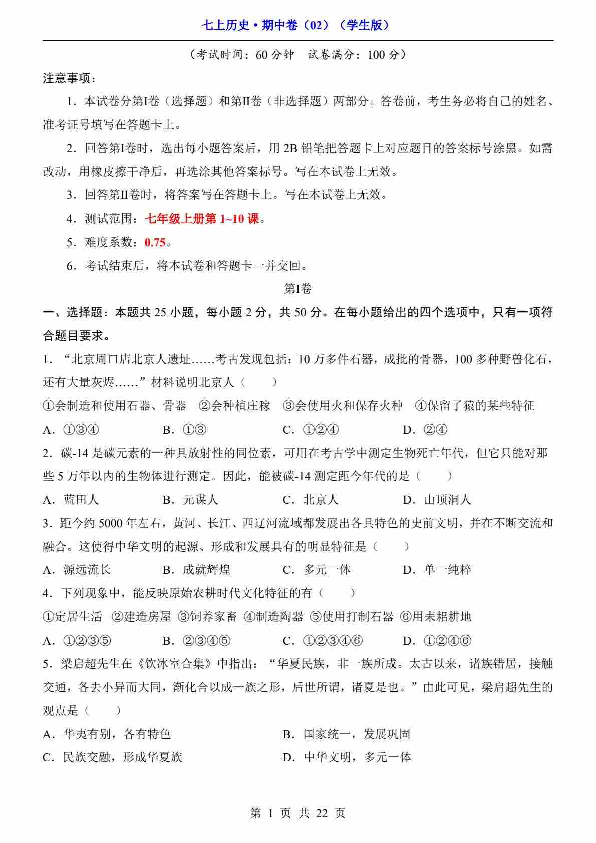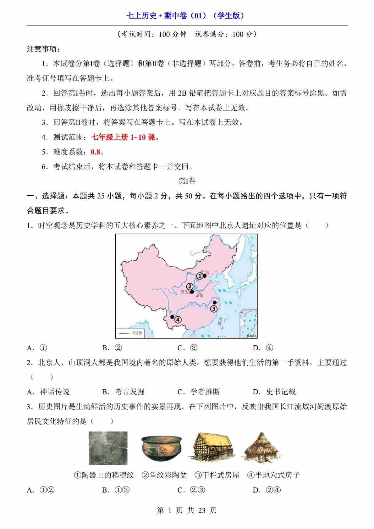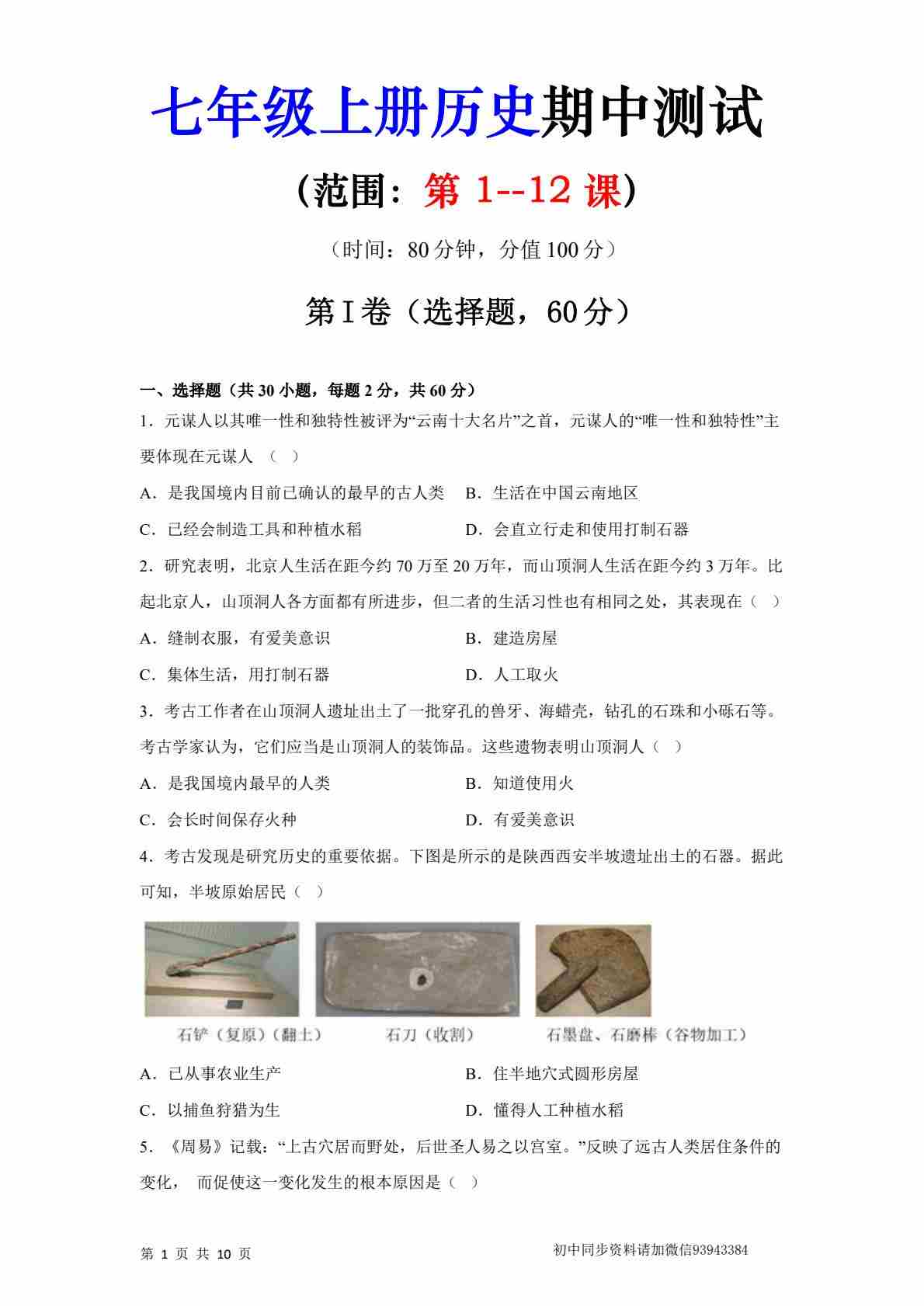 七年级历史期中测试(范围:第1--12课)【期中测试】 (原卷版)