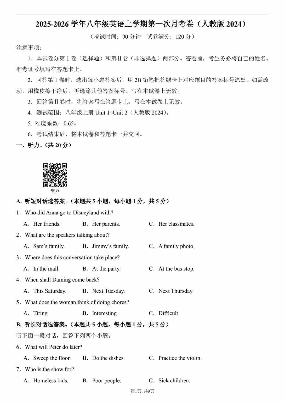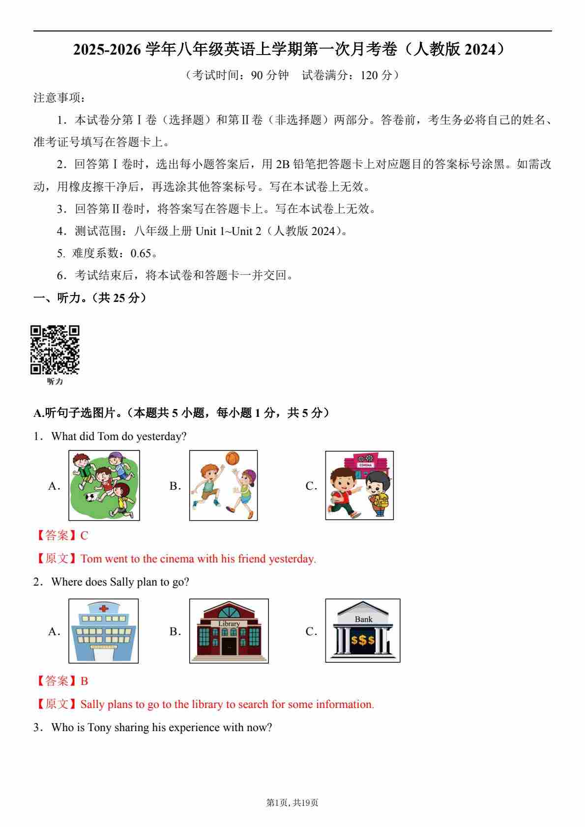 (人教版)八年级英语第一次月考卷01(考试版A4)【测试范围:八上Unit 1~Unit 2】(人教版2024)