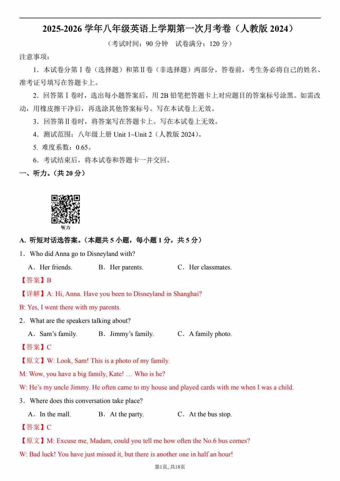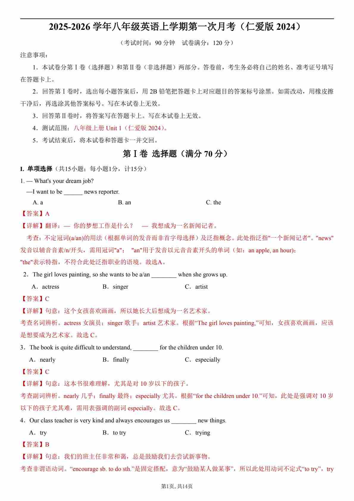 (人教版)八年级英语第一次月考卷01(全解全析)(人教版2024)