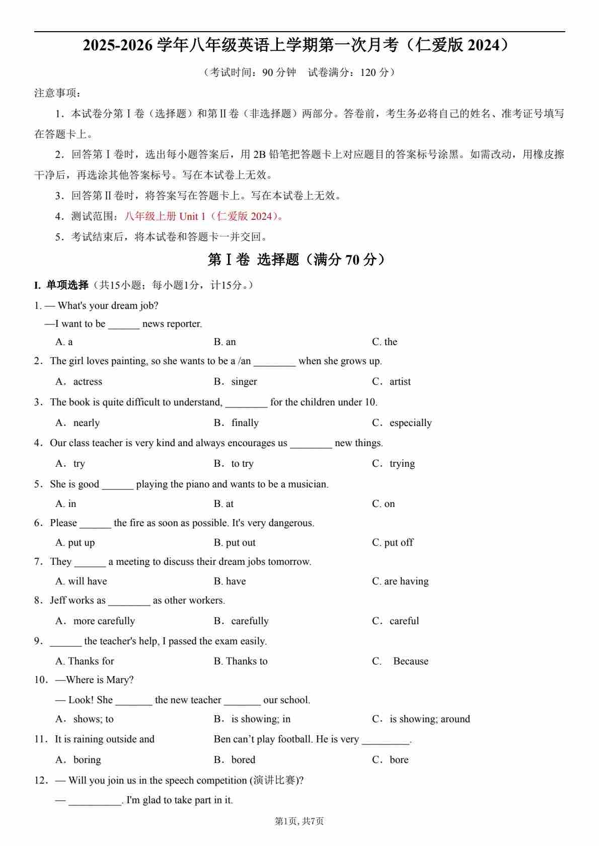 (仁爱版)八年级英语第一次月考卷(考试版A4)【测试范围:八上Unit 1】(仁爱版2024)