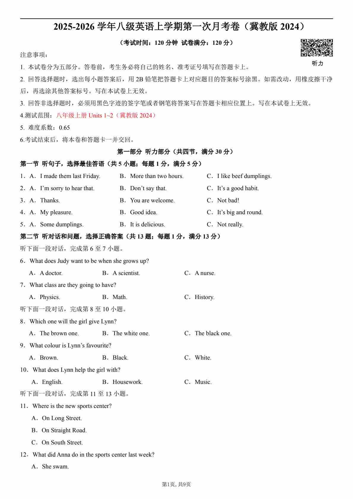 (冀教版)八年级英语第一次月考卷(考试版A4)【测试范围:Units 1~2】(冀教版2024)
