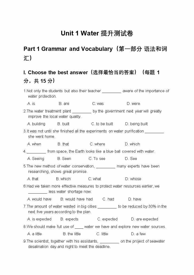 沪教版(五四制)八年级上册Unit 1 Water 提升测试卷--沪教54版