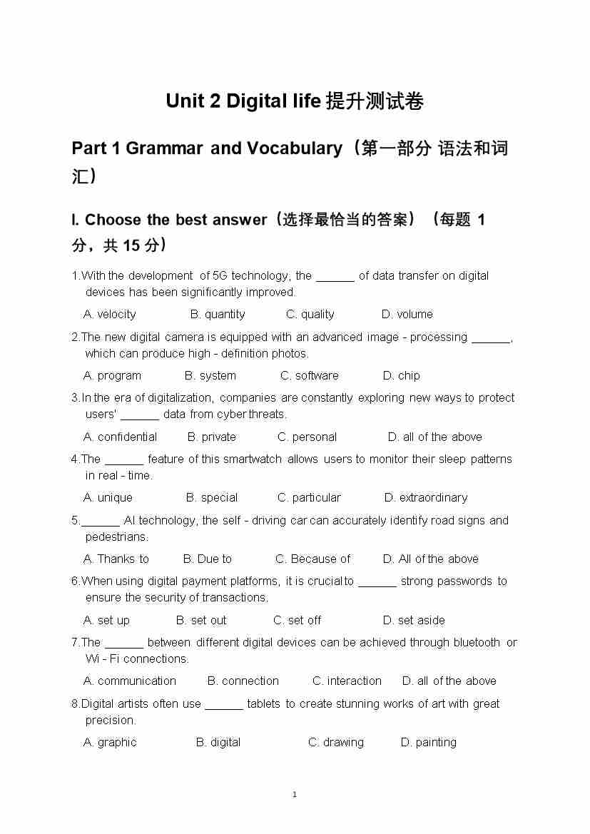 沪教版(五四制)八年级上册Unit 2 Digital life提升测试卷--沪教54版