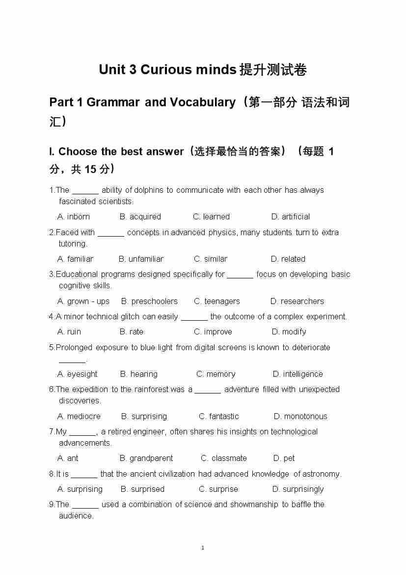 沪教版(五四制)八年级上册Unit 3 Curious minds提升测试卷--沪教54版
