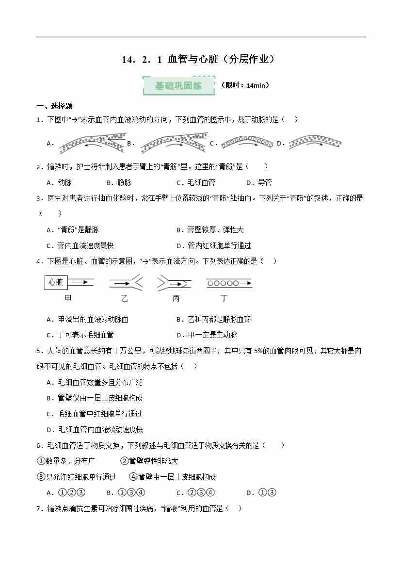 14.2 血管与心脏 第1课时(分层作业)(原卷版)