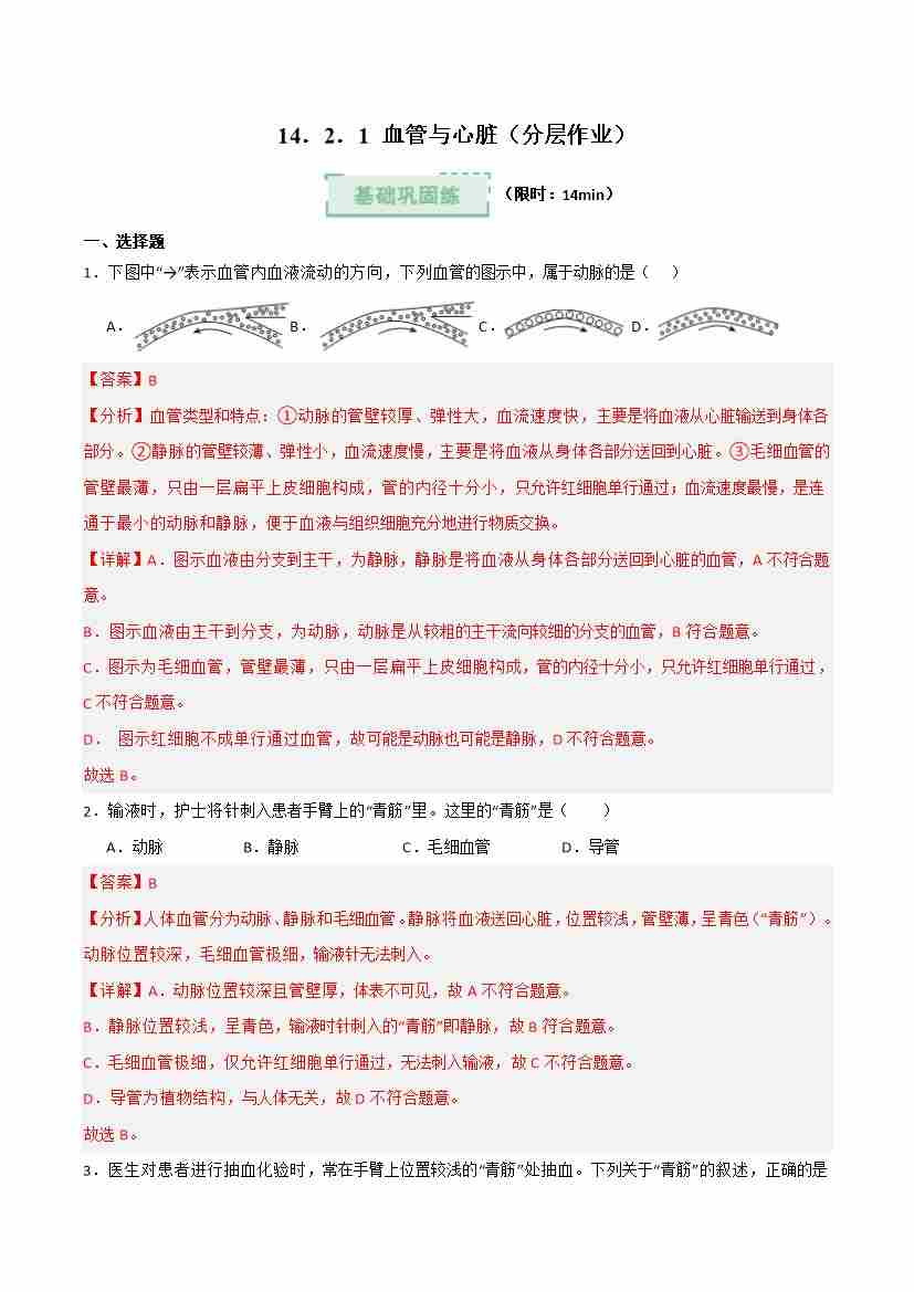 14.2 血管与心脏 第1课时(分层作业)(解析版)