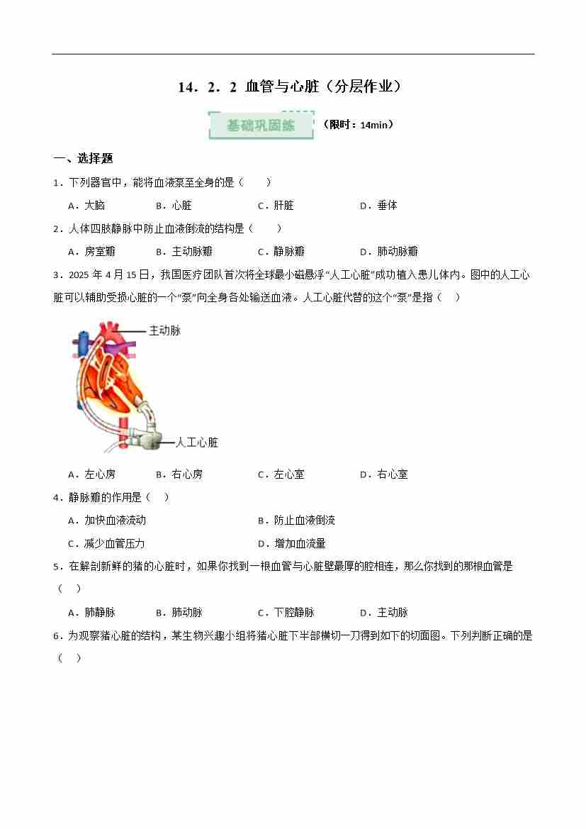 14.2 血管与心脏 第2课时(分层作业)(原卷版)