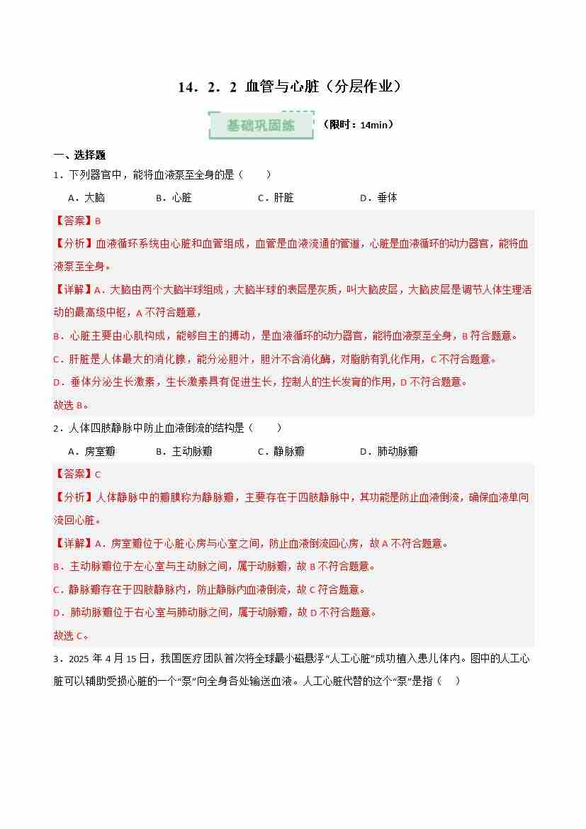 14.2 血管与心脏 第2课时(分层作业)(解析版)