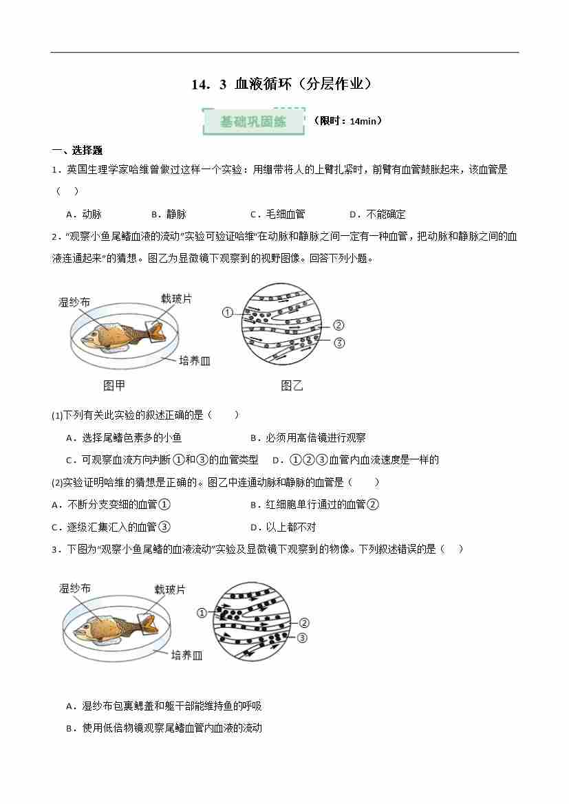 14.3 人血液循环(分层作业)(原卷版)