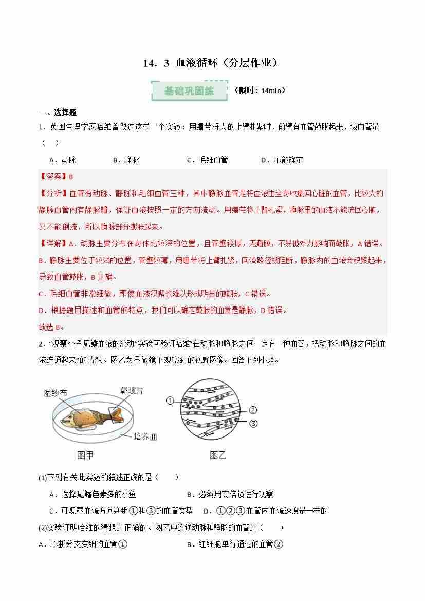 14.3 人血液循环(分层作业)(解析版)