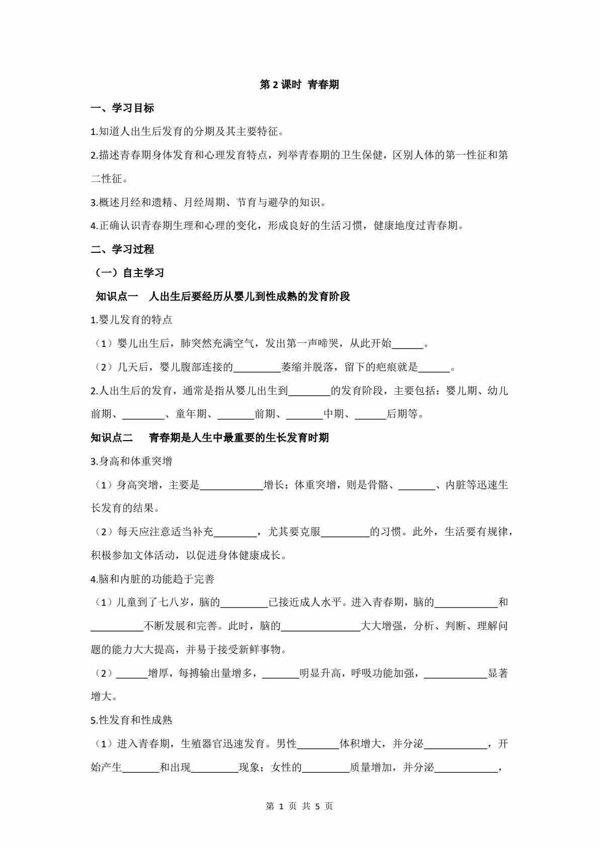 6.15.1 第2课时 青春期 学案 (含答案)