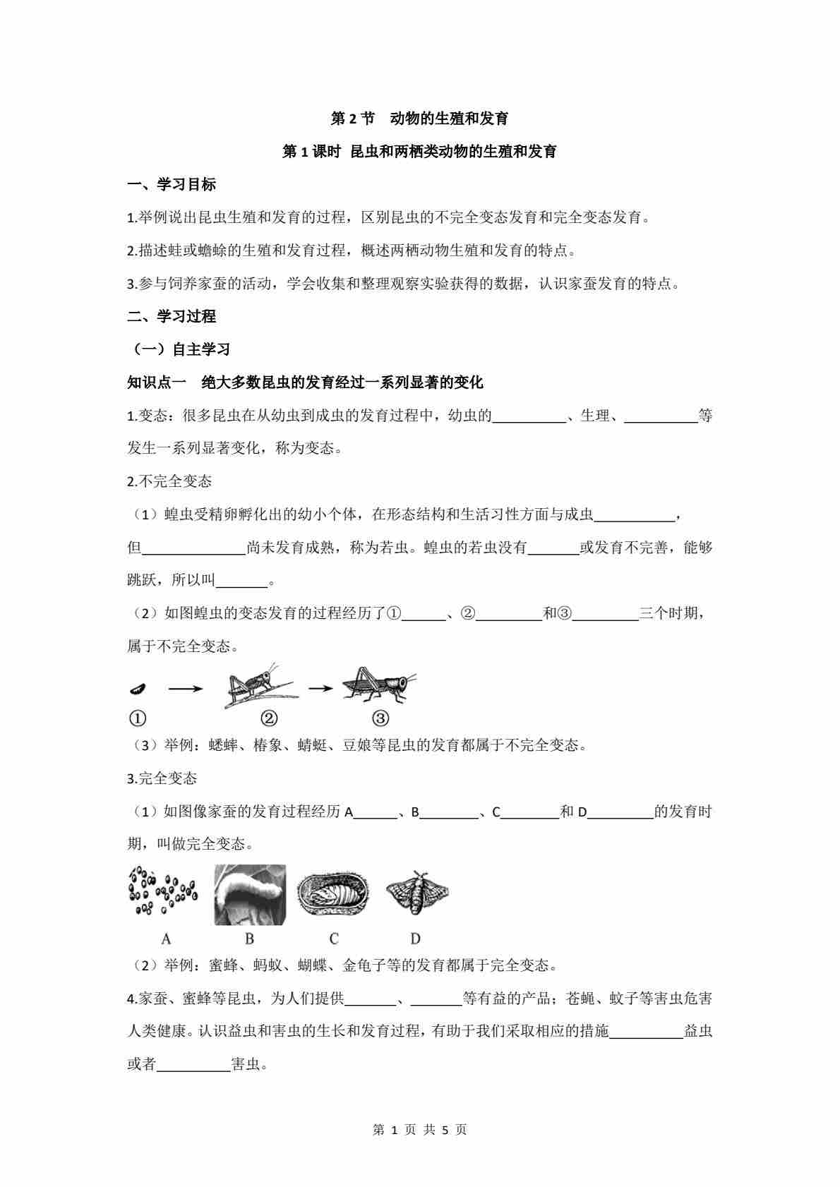 6.15.2 第1课时 昆虫和两栖类动物的生殖和发育 学案(含答案)