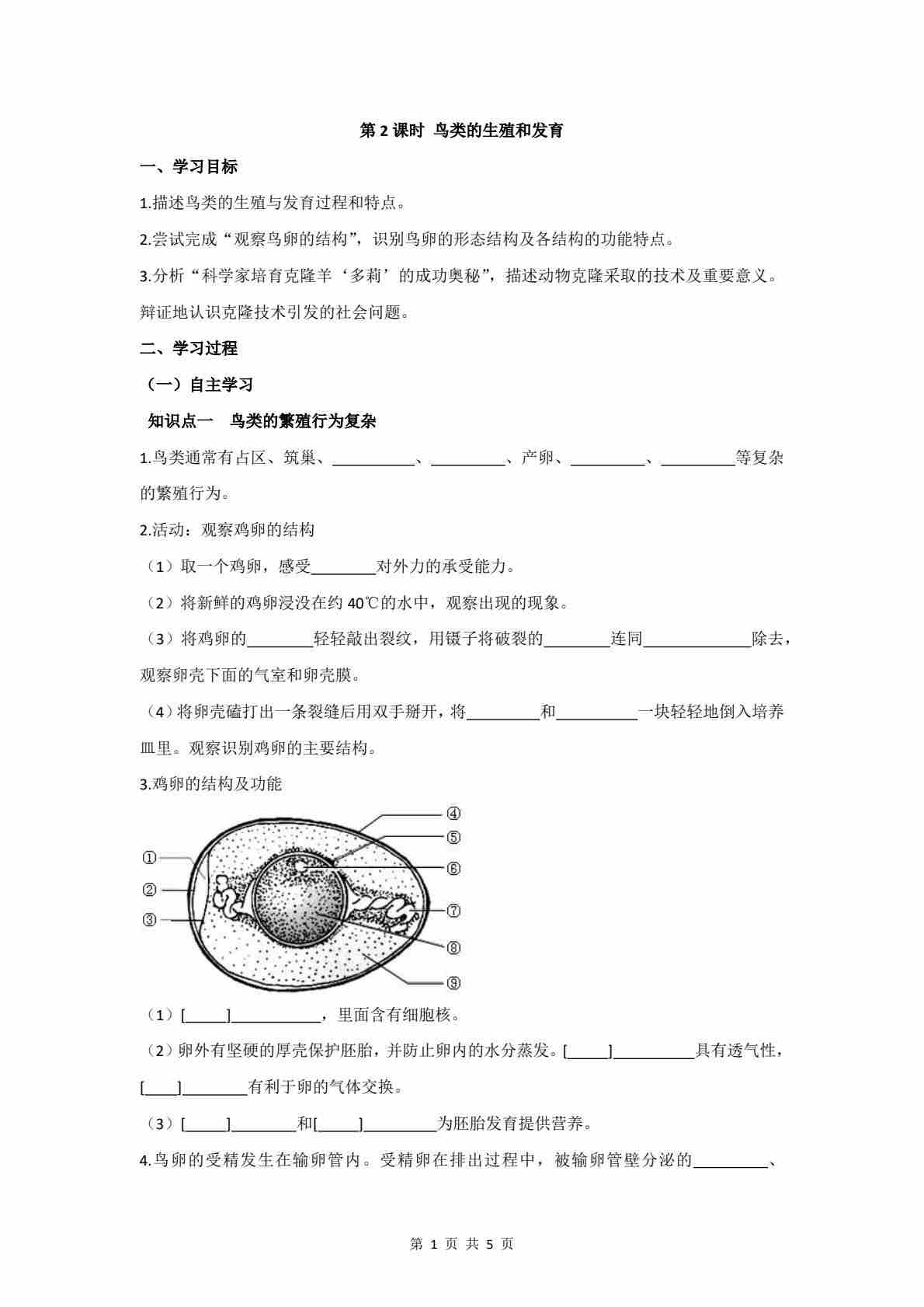 6.15.2 第2课时 鸟类的生殖和发育 学案(含答案)