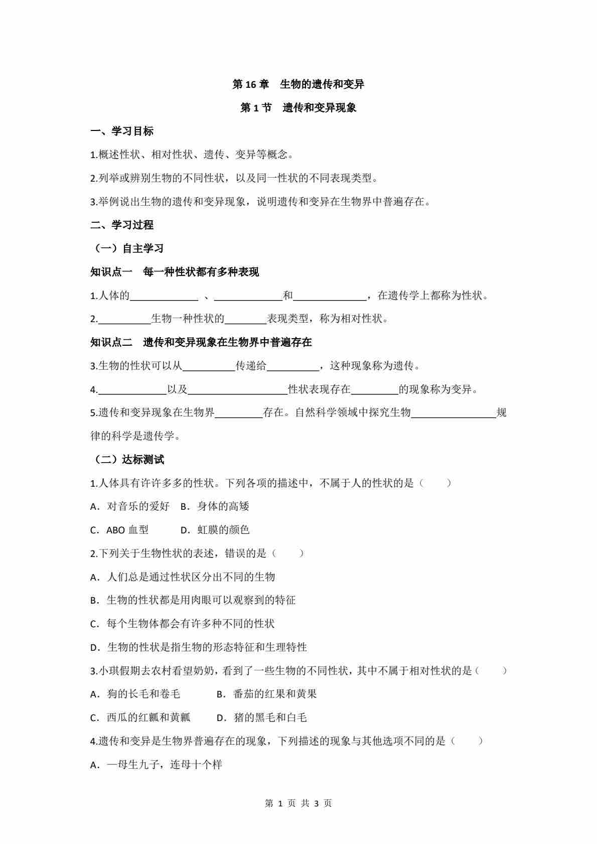 6.16.1 遗传和变异现象 学案(含答案)