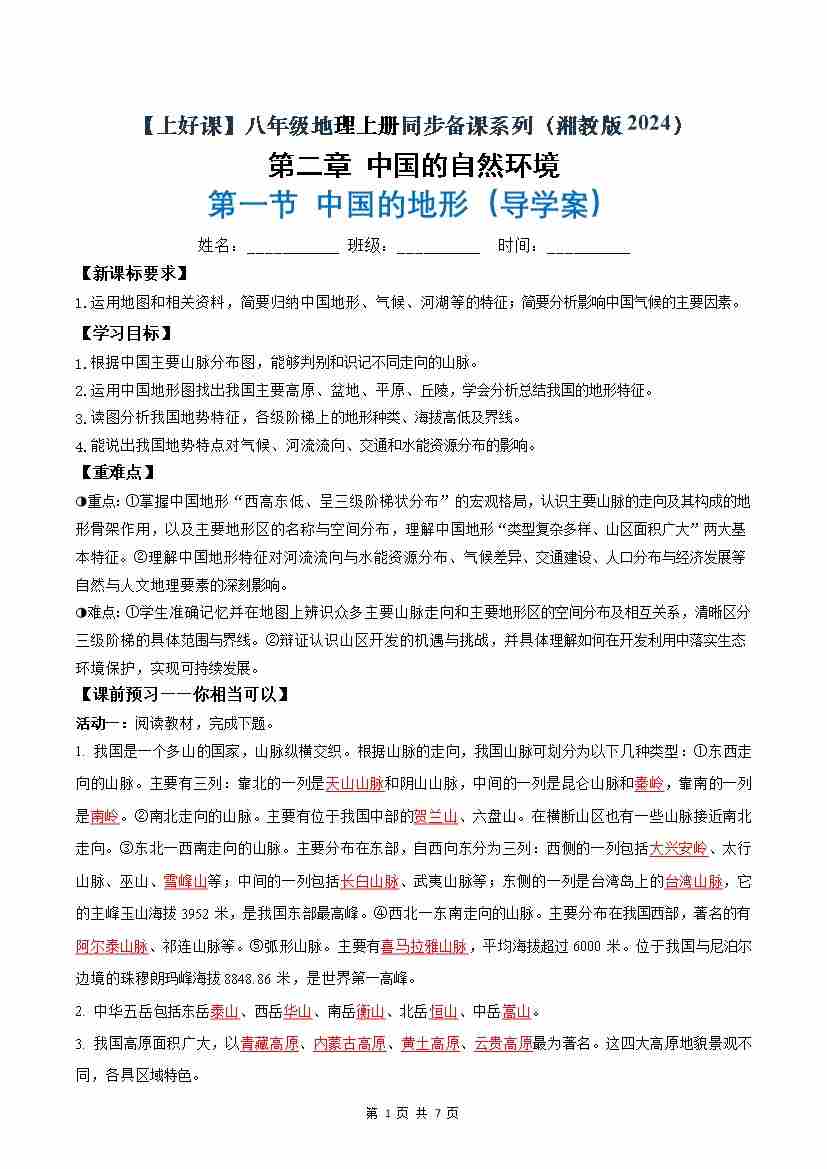 2.1中国的地形(导学案)(解析版)