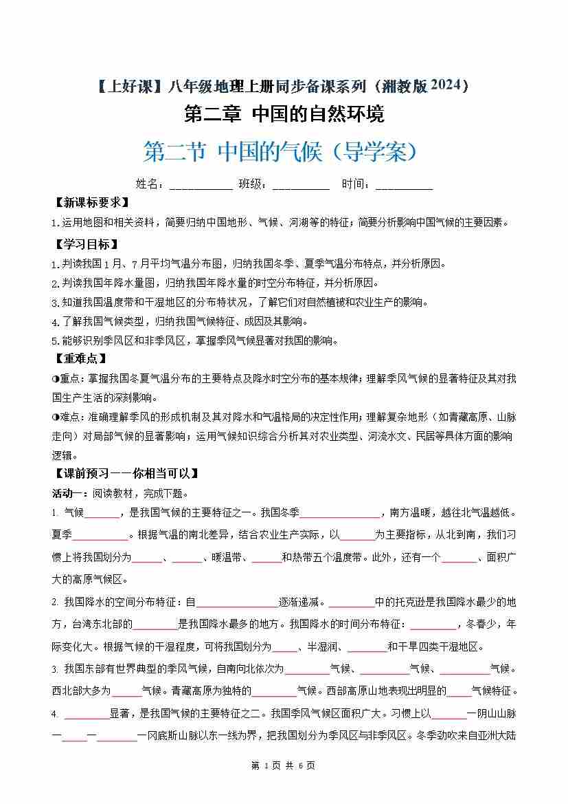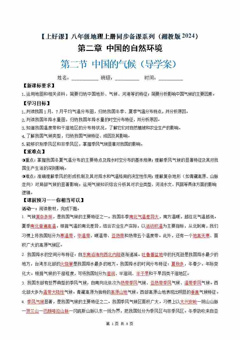 2.2中国的气候(导学案)(试卷版)