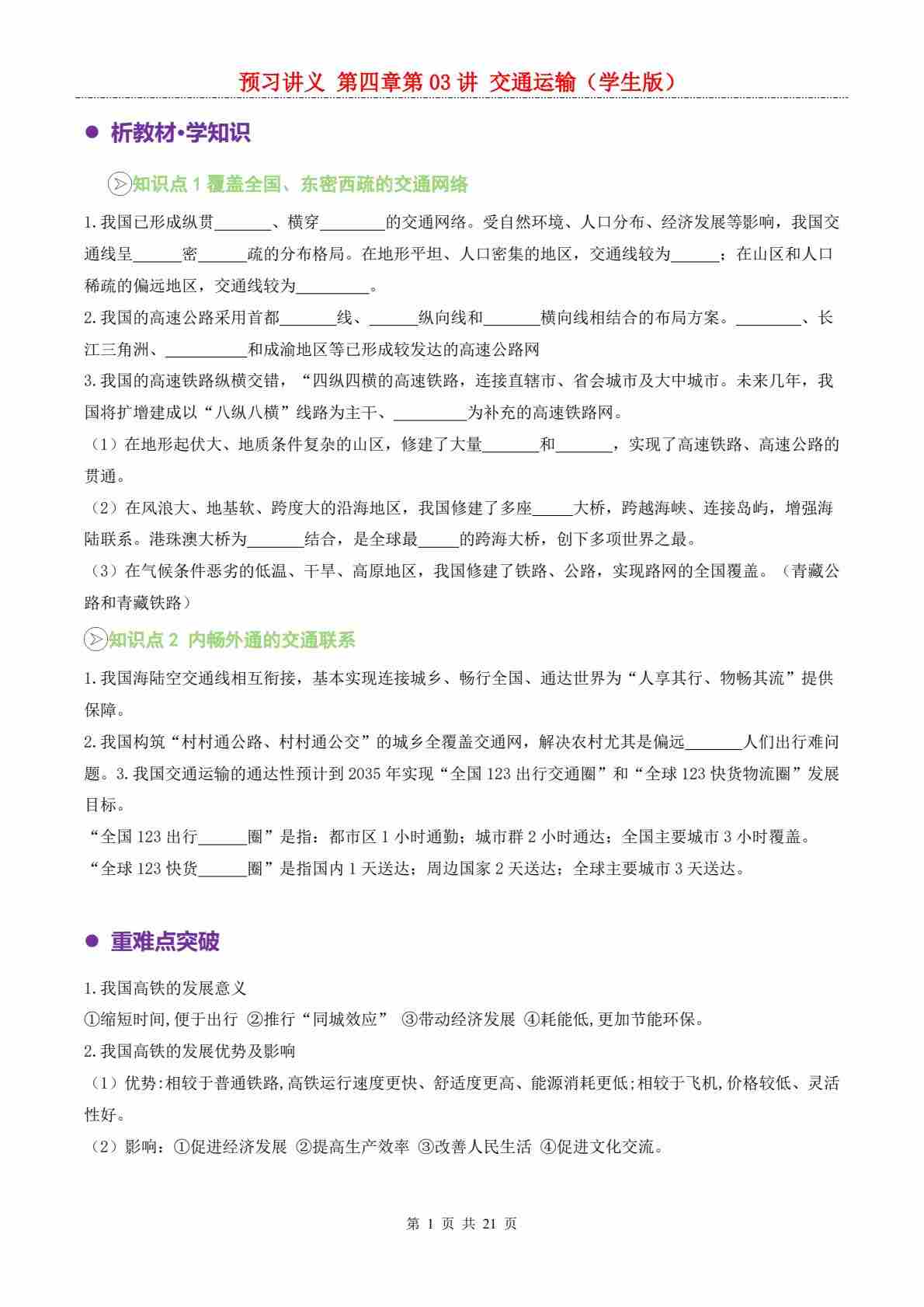 【预习讲义】第四章 第03讲 交通运输业---人教版