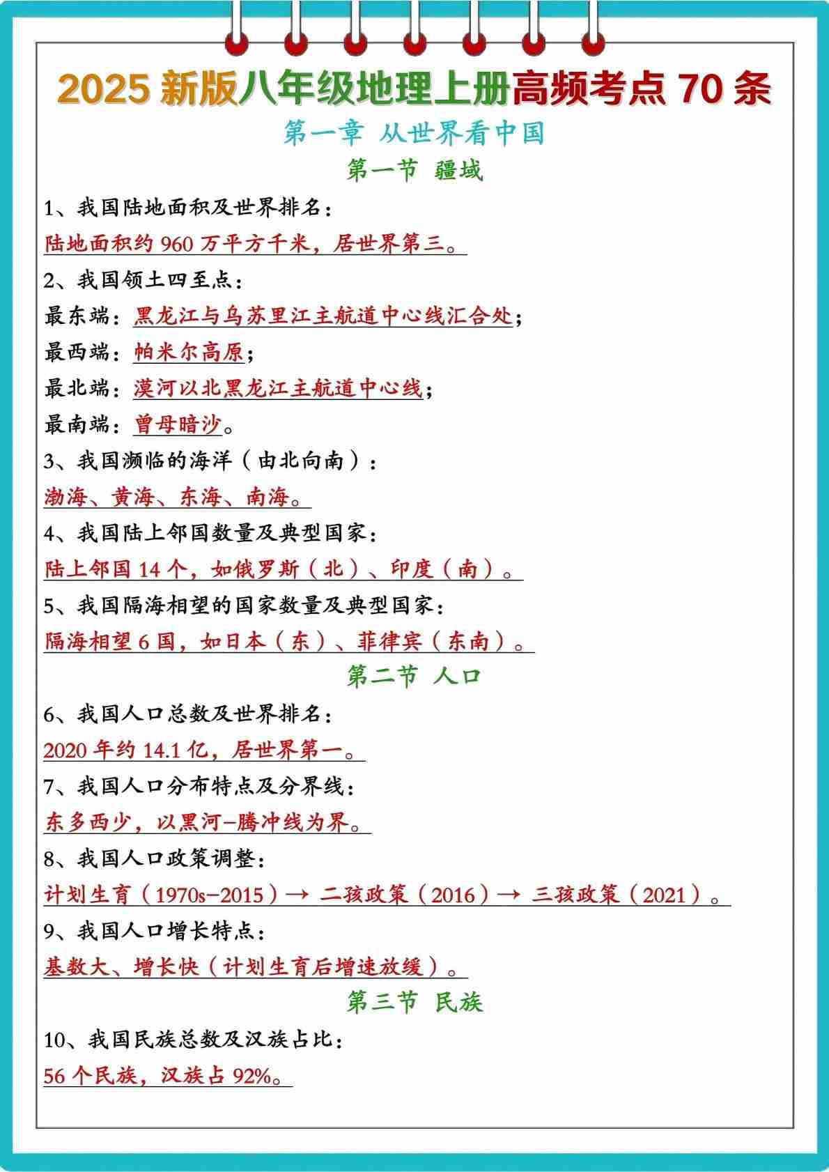 25秋八上人教地理高频考点70条