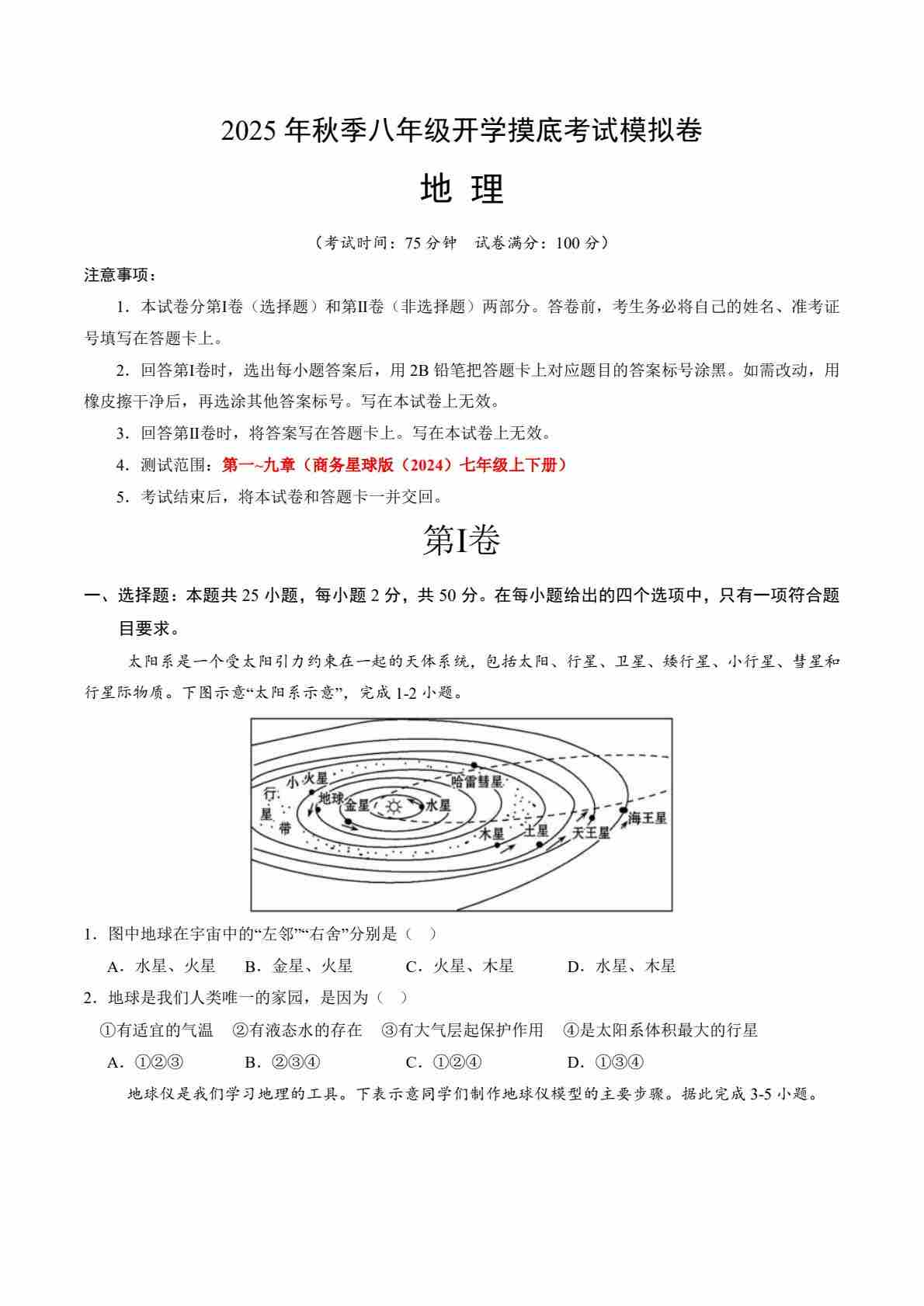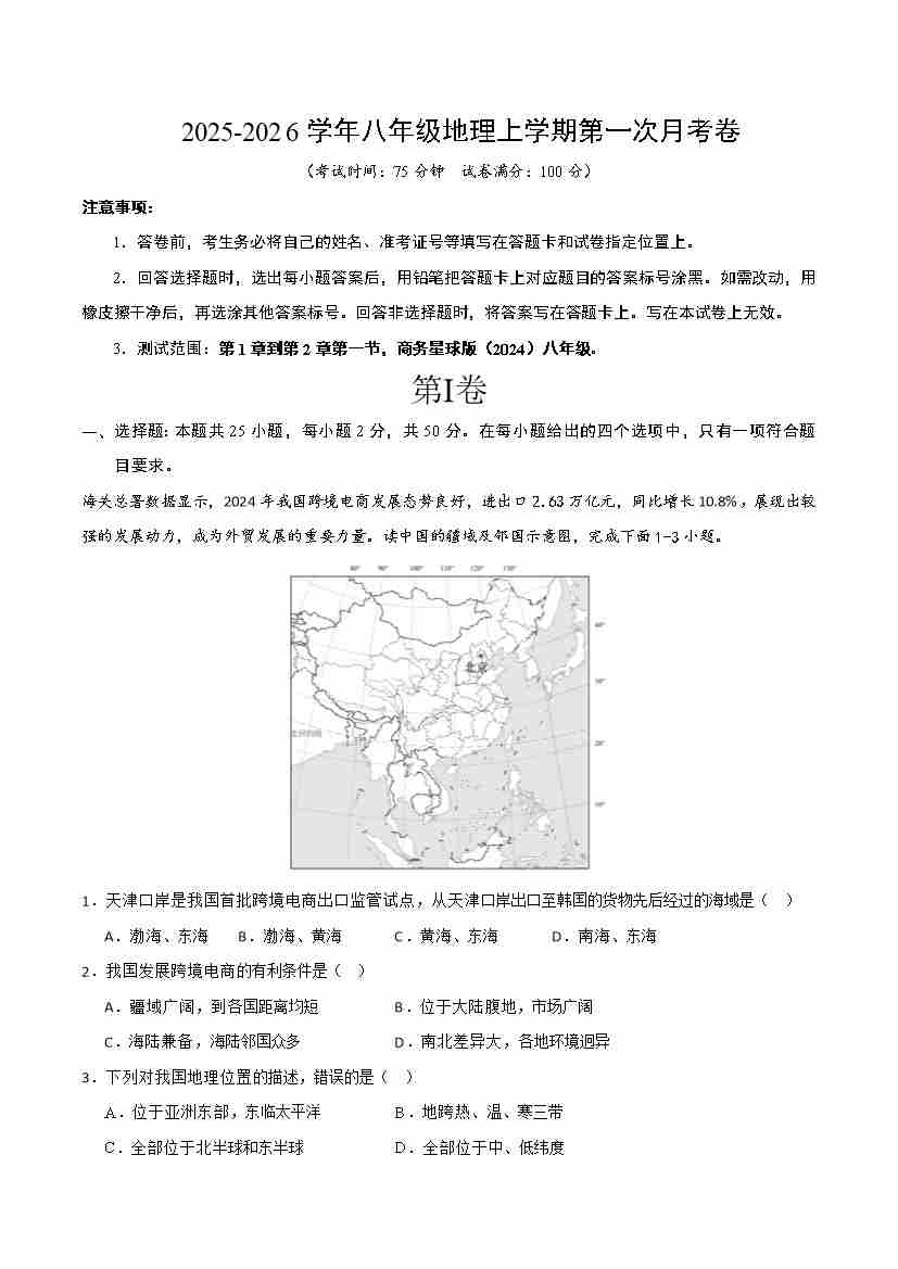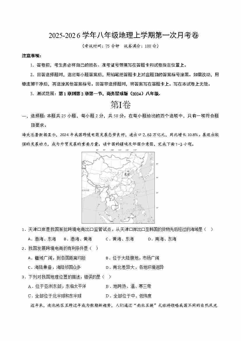 八上商务星球地理开学考(原卷版)