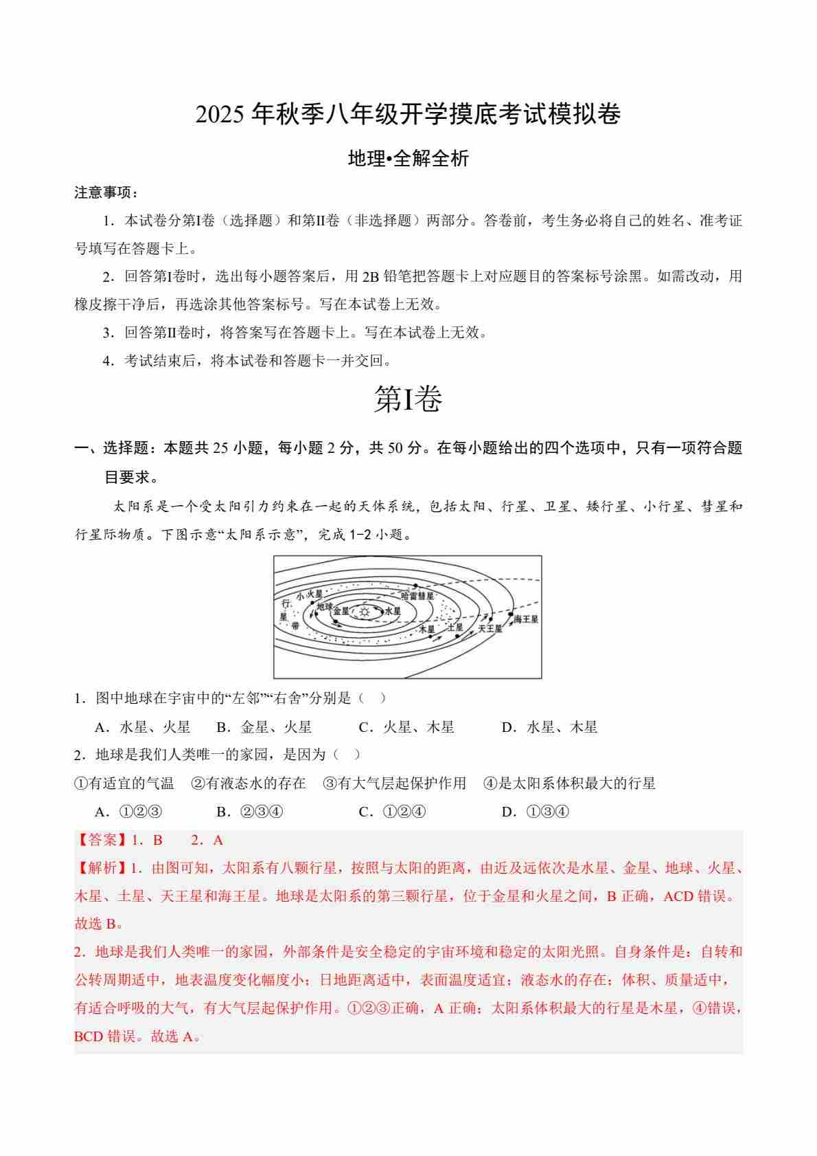 八上地理第1章测试·提升卷(详解版)