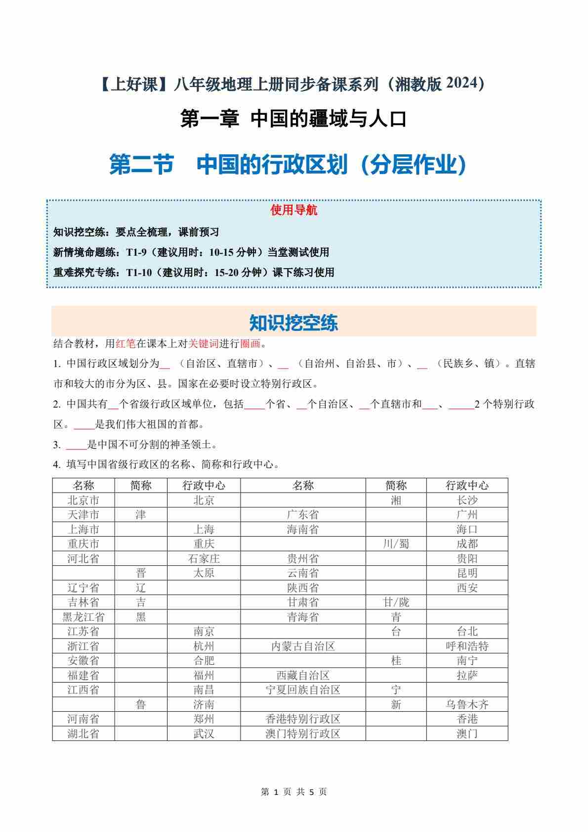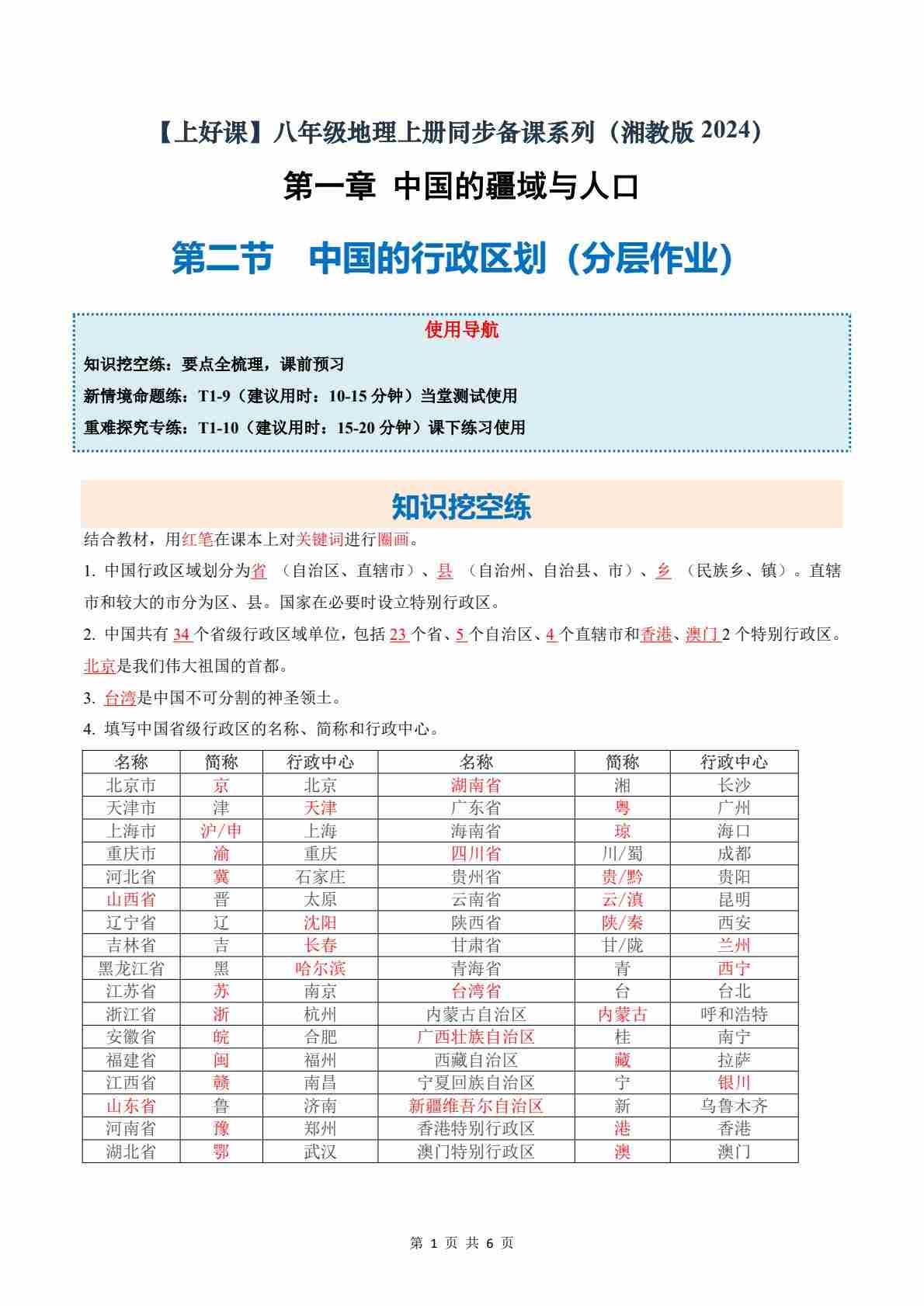 1.2中国的行政区划(分层作业)(试卷版)