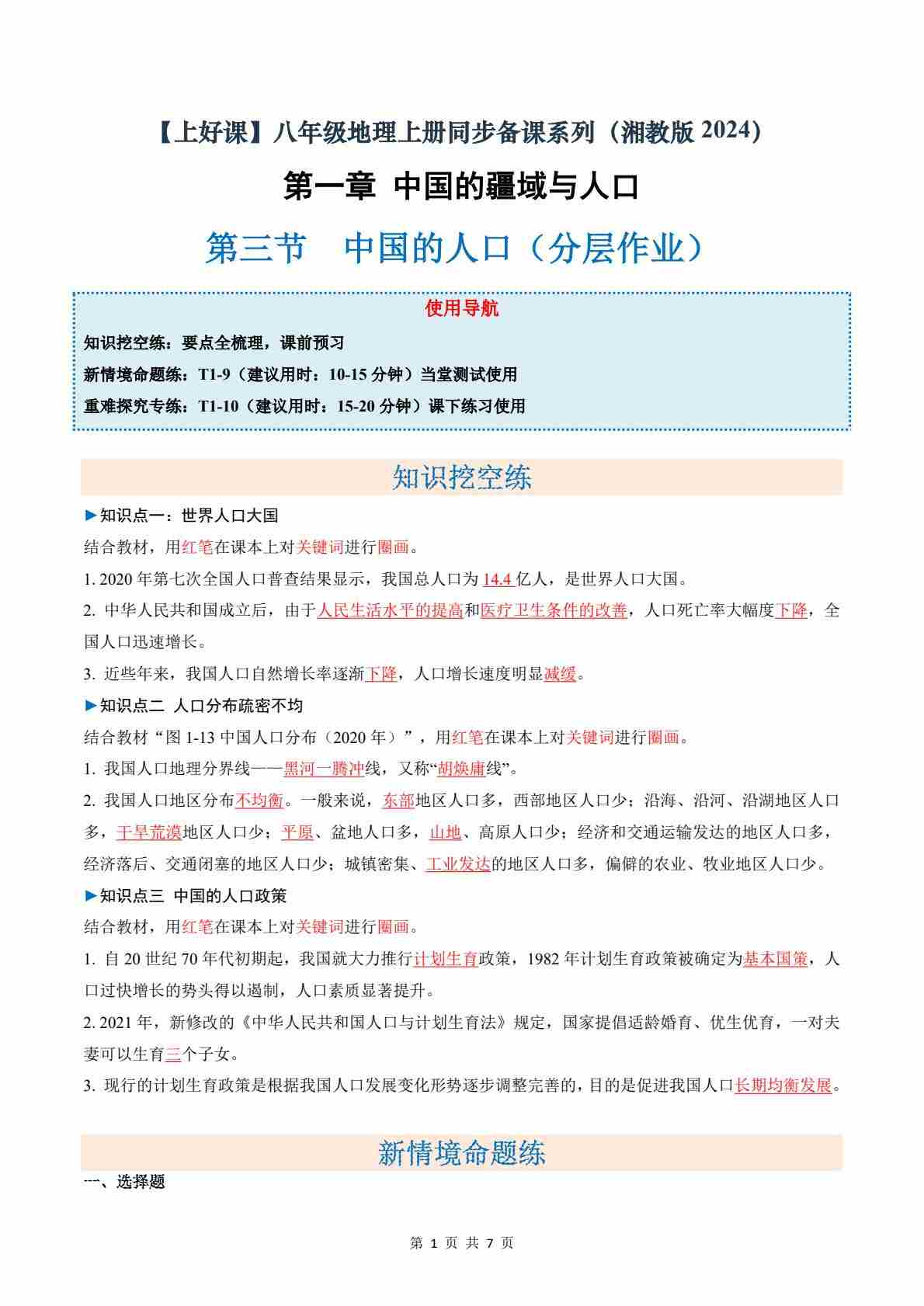1.3中国的人口(分层作业)(原卷版)
