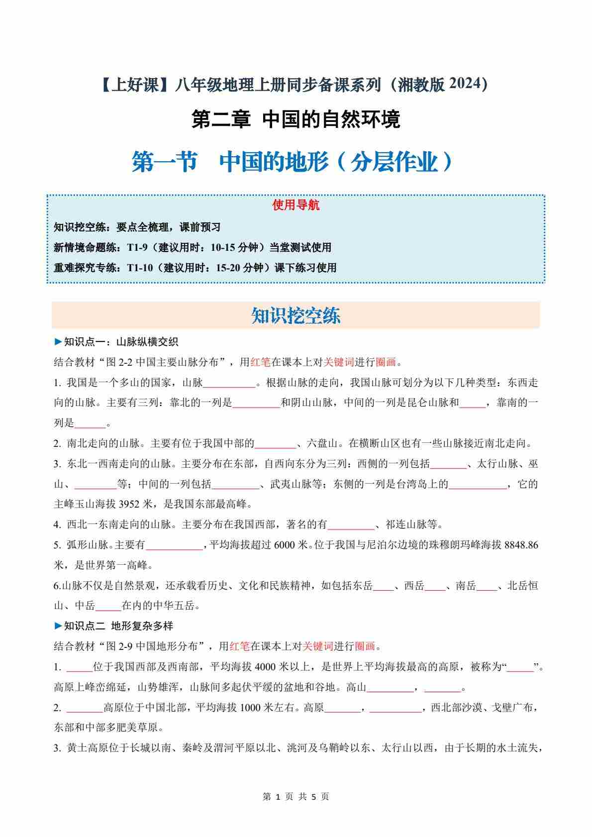 2.1中国的地形(分层作业)(试卷版)