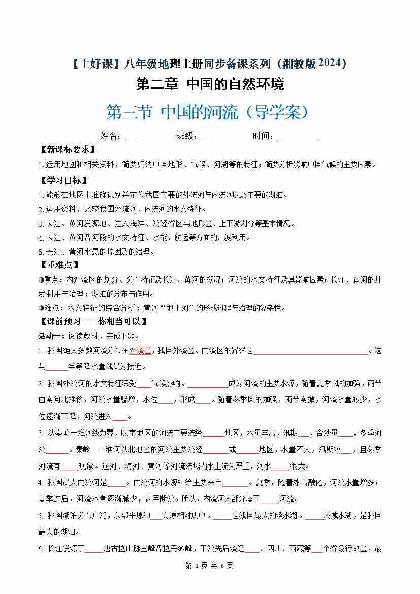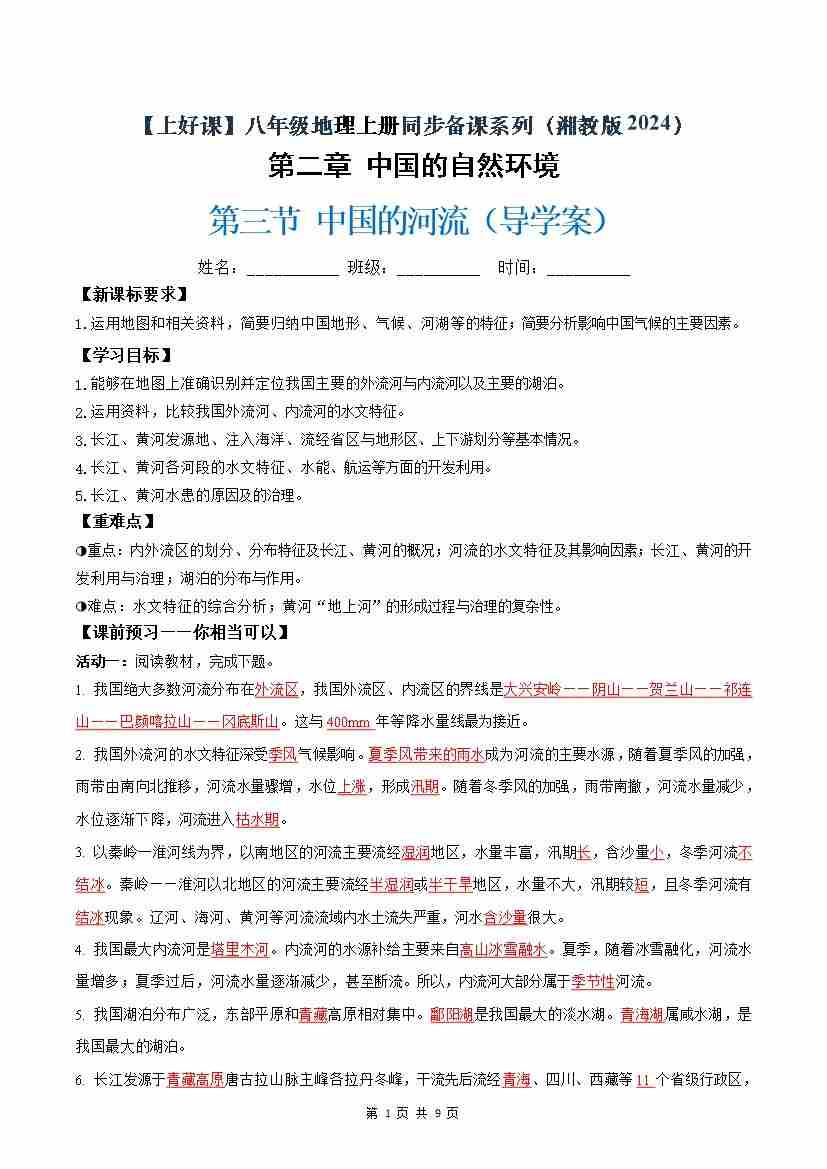 2.3中国的河流(导学案)(试卷版)